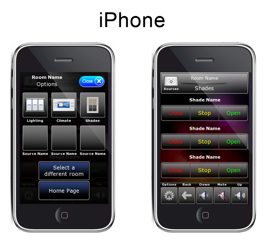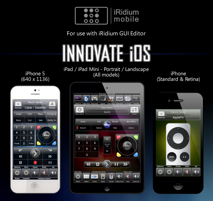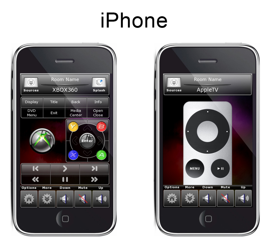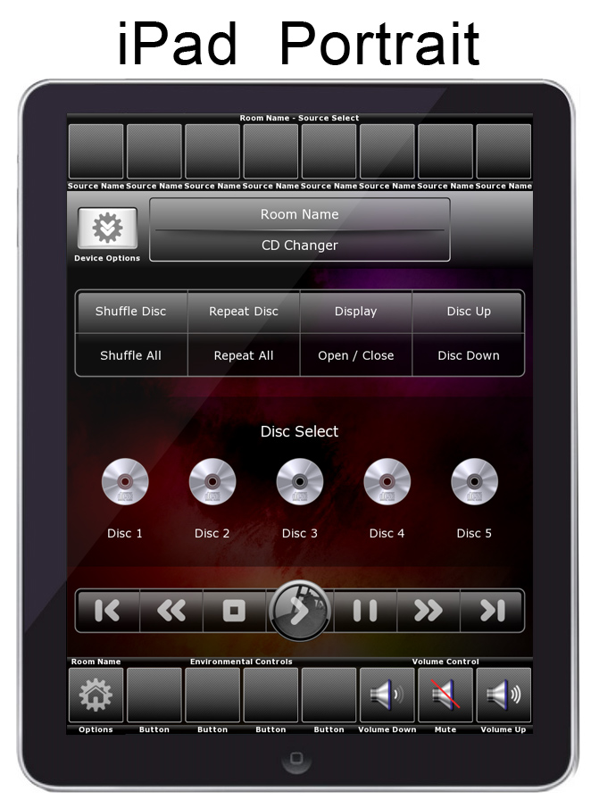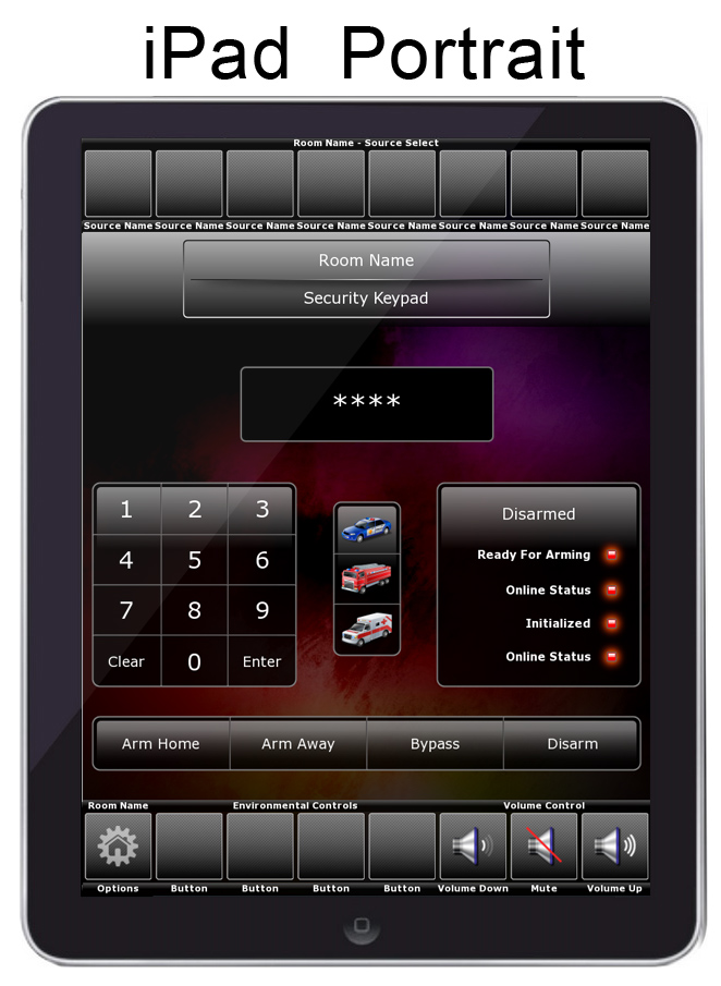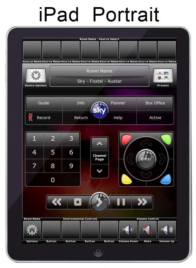 Pages: Apple TV, Cable/Satellite, Favorite Channels, CD Changer, FM Tuner, DVD/Blu Ray, Climate, Lighting , Media Server, PlayStation 3, Projector, Satellite Radio, Tivo DVR, TV Control, Wii, Wii U, XBOX360, Security Keypad, Confirm Shut Down, Room Select, Home Page, etc.