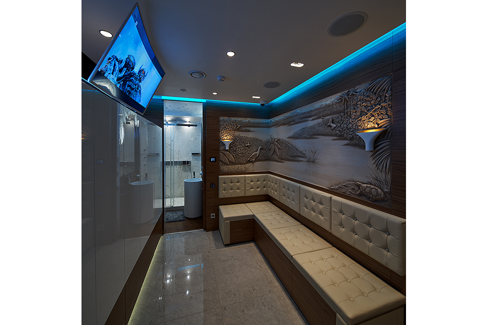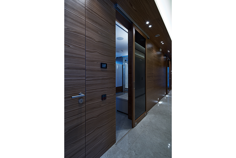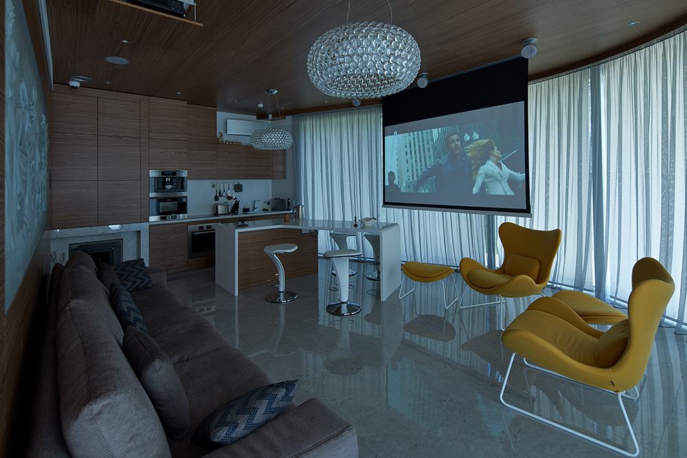 Climate is created and supported by Domintell automation, ventilation and conditioning systems by different manufactures that work via Modbus protocol. System of automatic ventilation is realized. It gets switched on and selects required power depending on the data from air quality sensors with a capability to control air humidity. The TV-set is installed on the ceiling turning mount. It allows to watch video comfortably from different places, standing at the cooker in the kitchen or sitting in the arm-chair in the sitting room. Besides the TV-set there is a system of projecting video in the sitting room.The screen and the projector are built-in the ceiling and appear only when they are switched on. When “projecting video” scene is on, and if the TV-set is turned, first it goes back to the initial position and then the screen starts moving. And when the screen is down, TV mount is blocked.