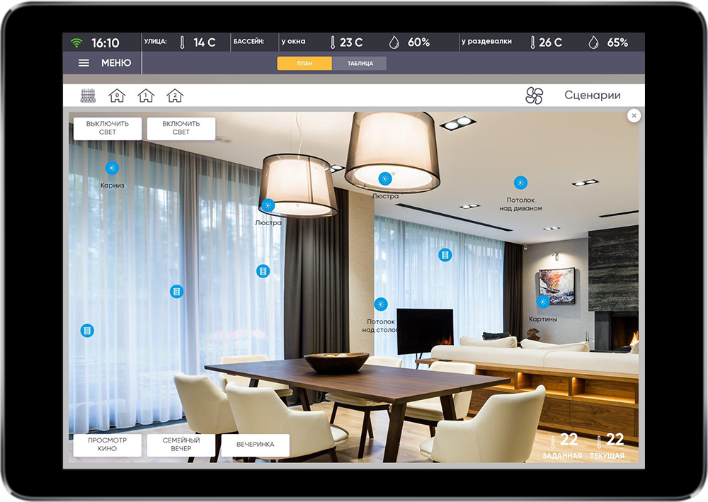 The main task was to realize simple control of comfort systems and single security control of the house and the surrounding territory.