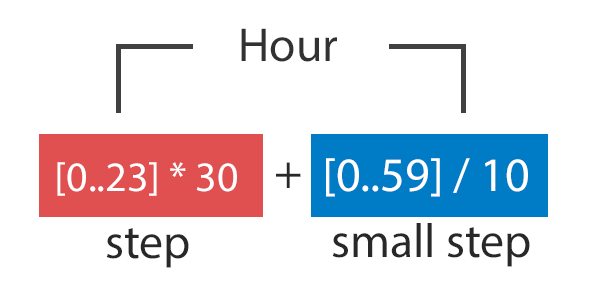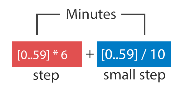 // Calculating the turning angle for the minute hand Minutes * 6 + Seconds / 10 Minutes * 6 + Seconds / 10