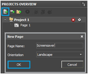 1.1. Create a new page and name it <>bScreensaver with the help of Add Page button in Projects Overview panel.