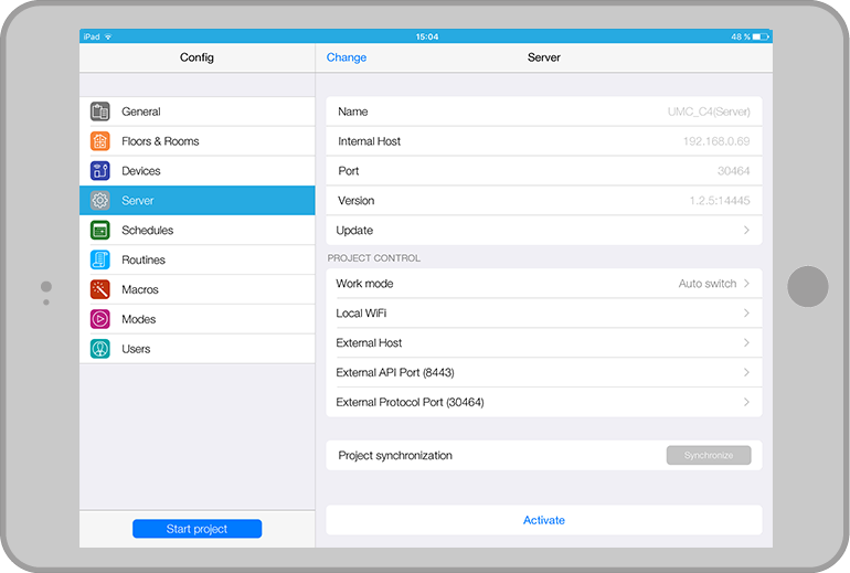 After you connect a server, you have to load the configured project to the server by clicking the button “Activate”. After activation, such settings of a server, as a software update, changing of net settings and settings of a project via Internet become available for a user.