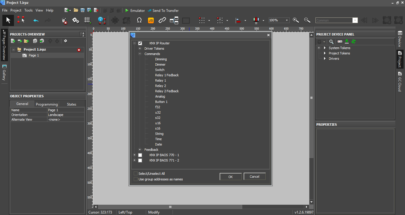 The built-in drivers just like the interface are set up in iRidium studio. They are standardized, have detailed documentation and examples. Work with such drivers is easy and fast. For example, channels for control of KNX equipment are added with the help of project import from ETS and channel for control of HDL equipment are added with the help of the scanner. After adding the channels you need to input the settings for connection and the driver is ready for use in your project. Import and scanner functions are also available for Crestron, Modbus, Clipsal, BACnet, Duotecno, Domintell drivers.