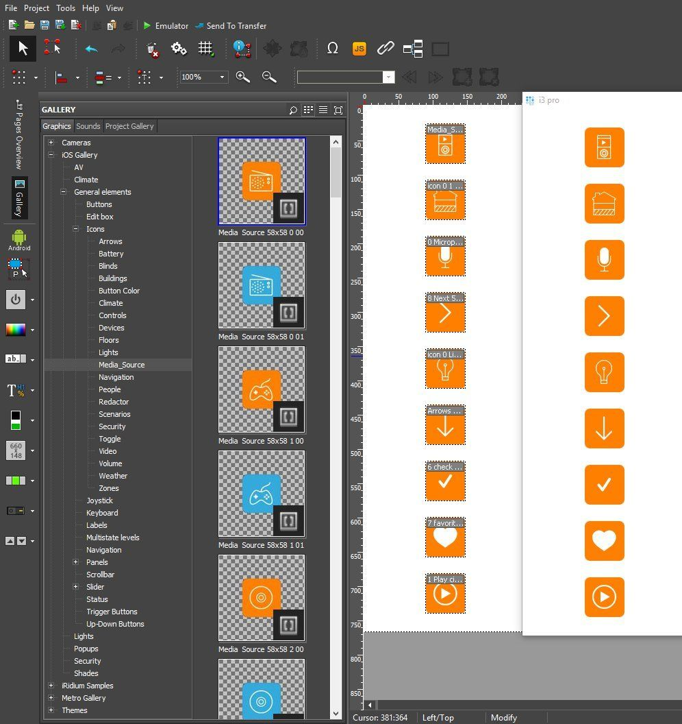 To save time at interface creation you can use ready items from the editor gallery: icons for all Smart home functions, different styles of ready pages to control AV equipment, links to images from cameras. You can also form your own gallery and use it in your projects.