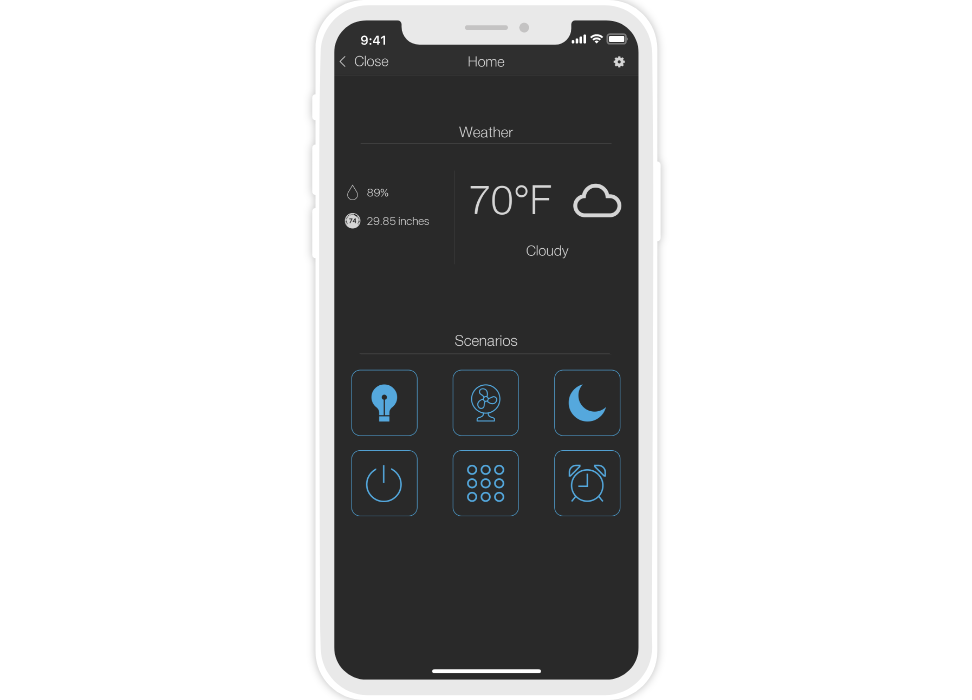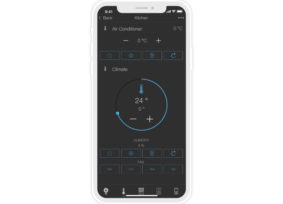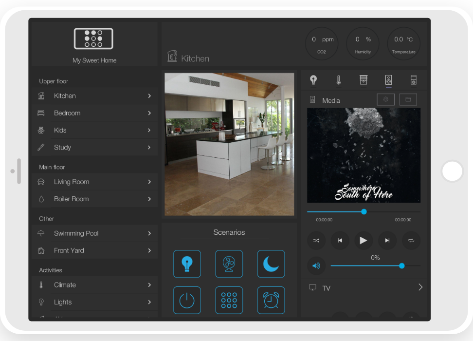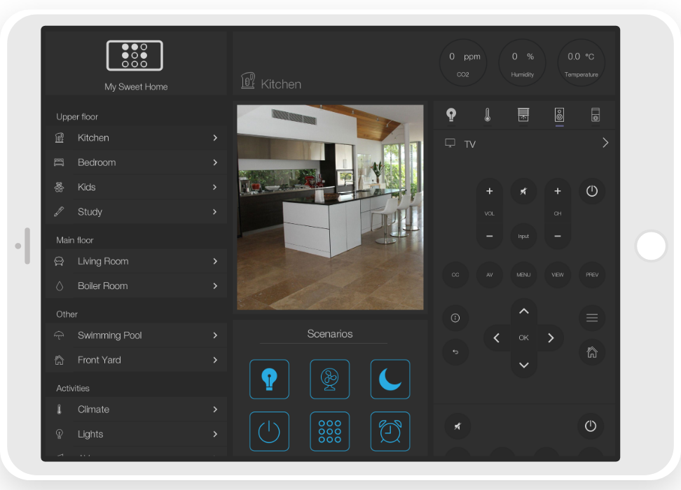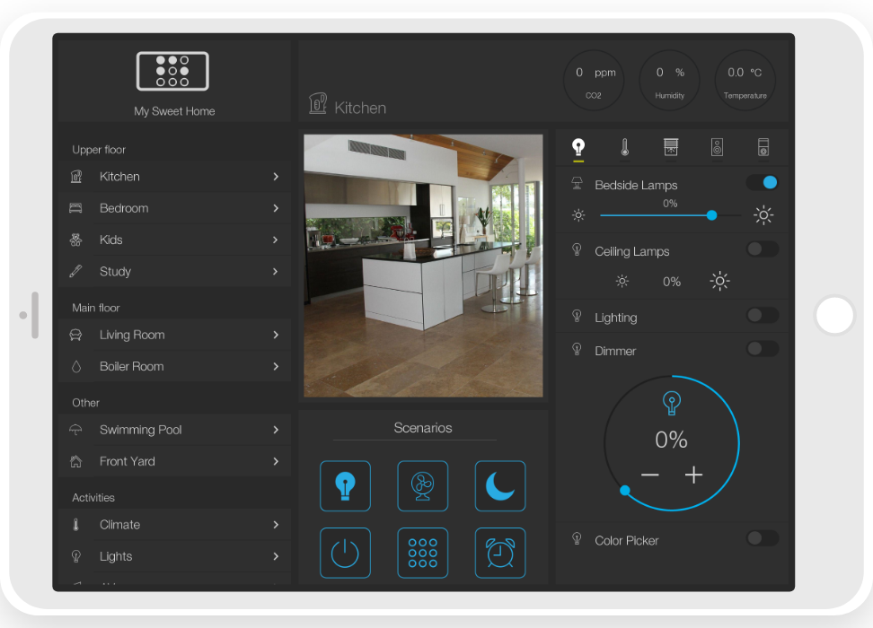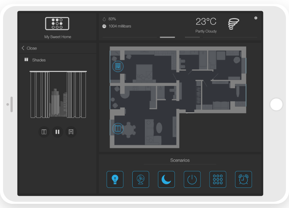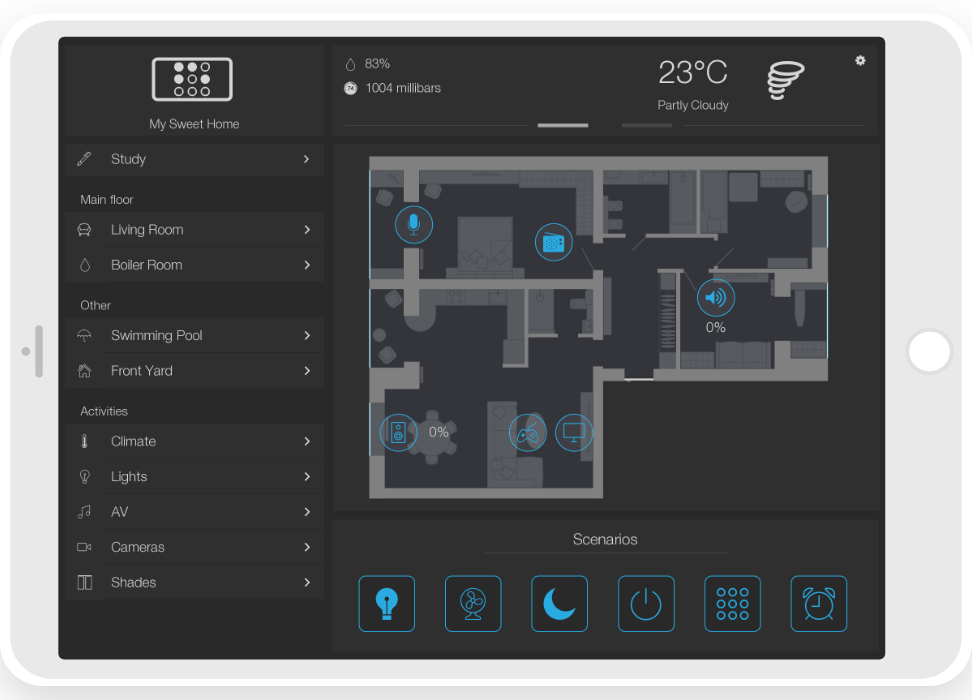 ready widgets to control light, blinds (with animation), cameras, climate, Audio/Video equipment, scenes.
