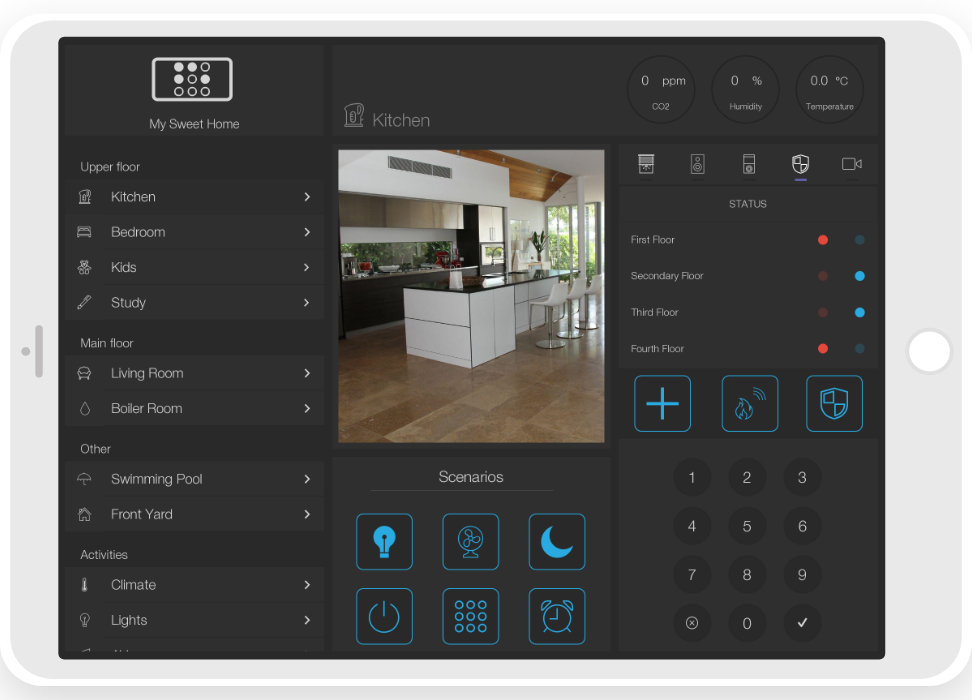 info blocks of temperature, humidity, CO2 level in rooms;