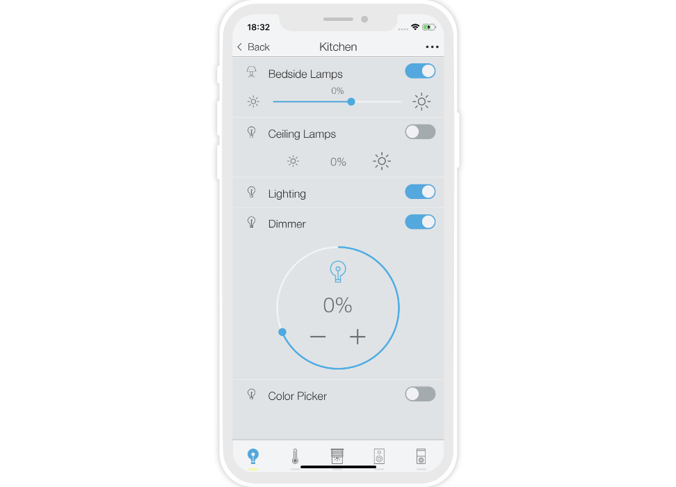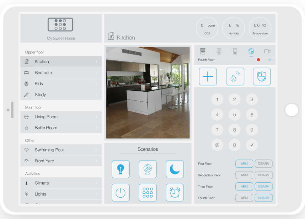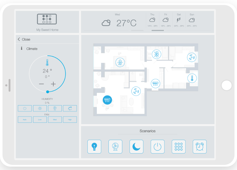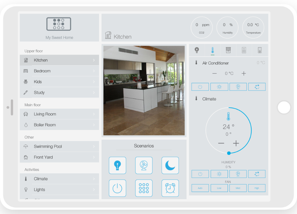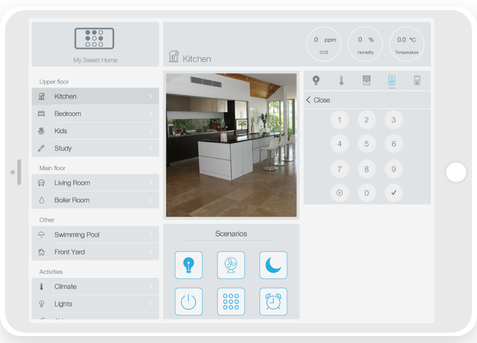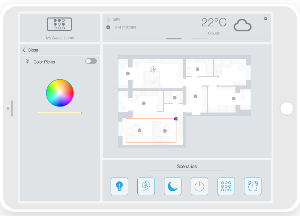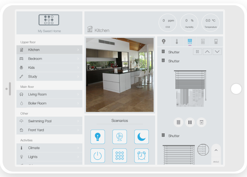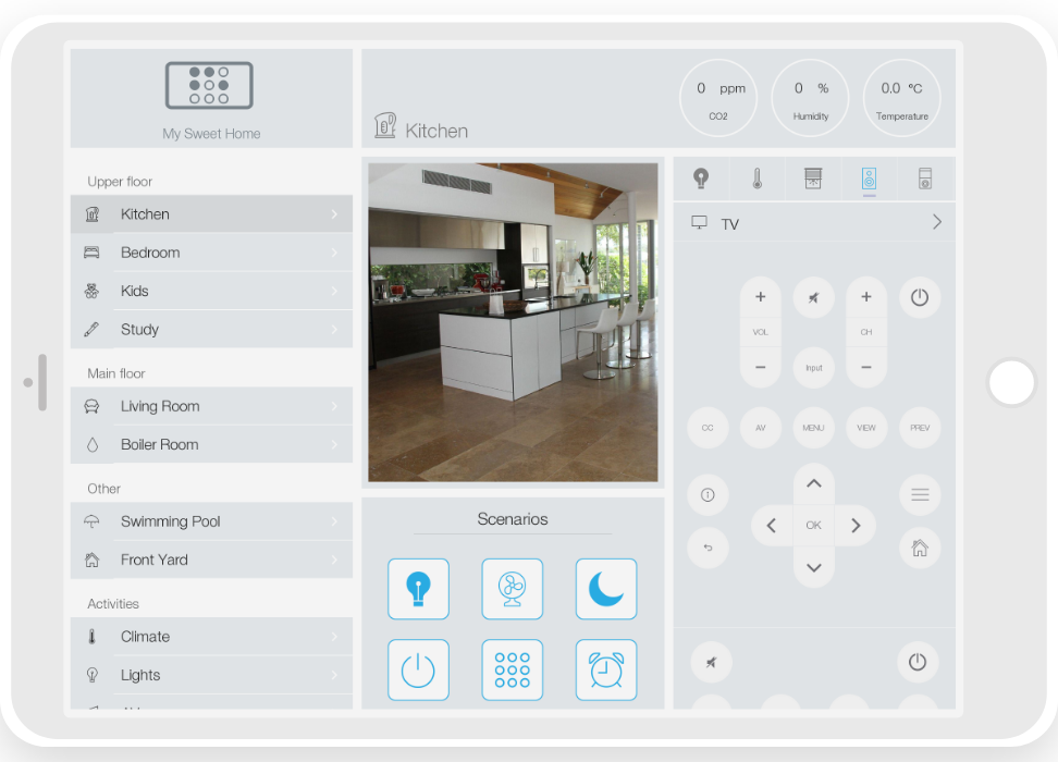 ready widgets to control light, blinds (with animation), cameras, climate, Audio/Video equipment, scenes.