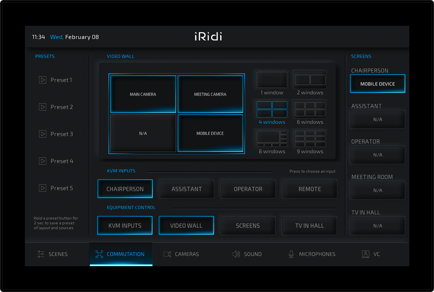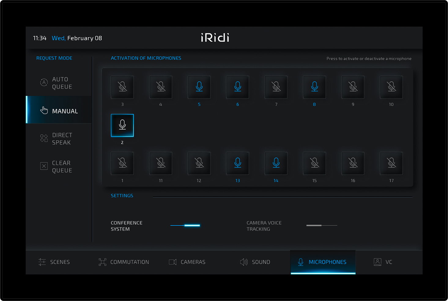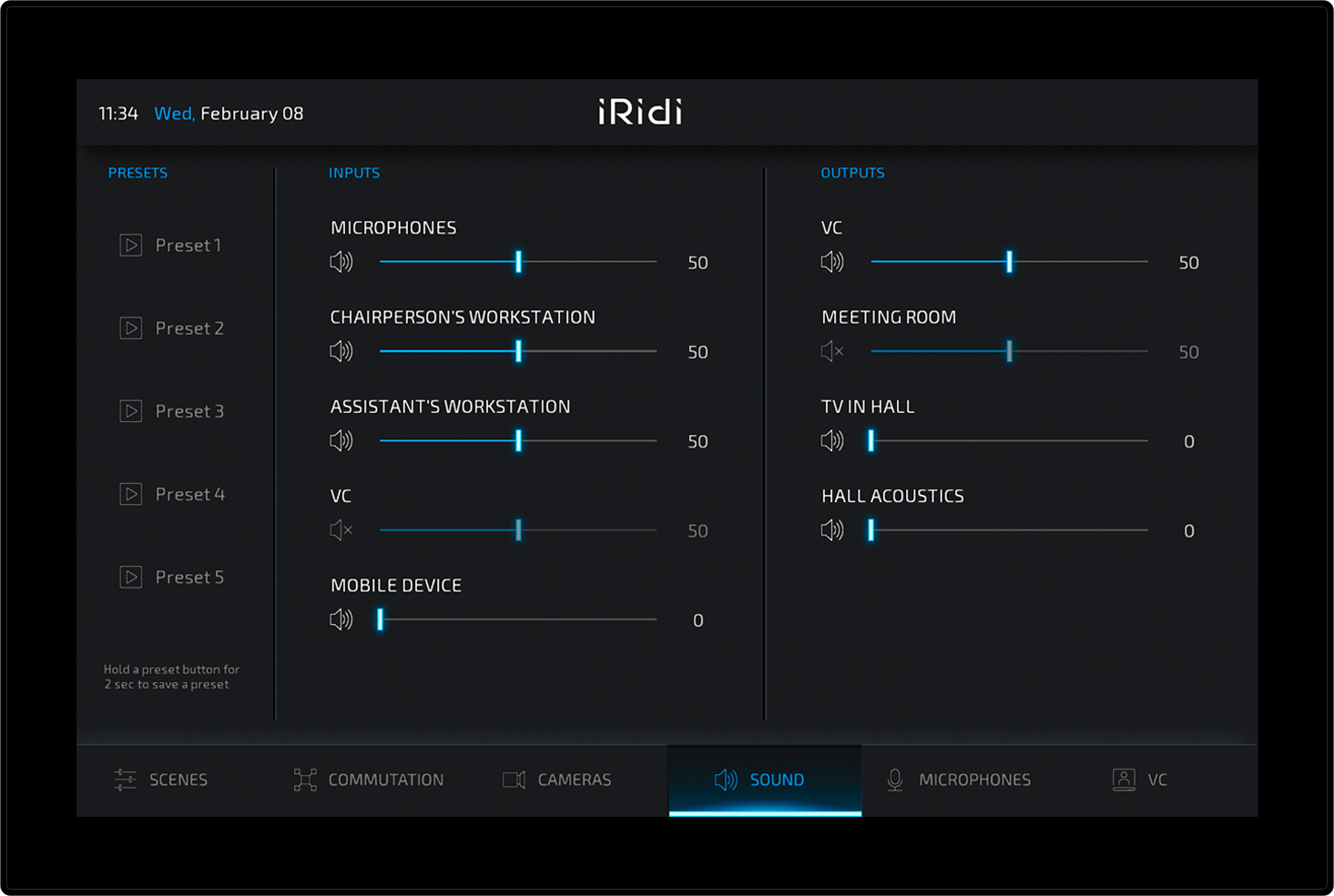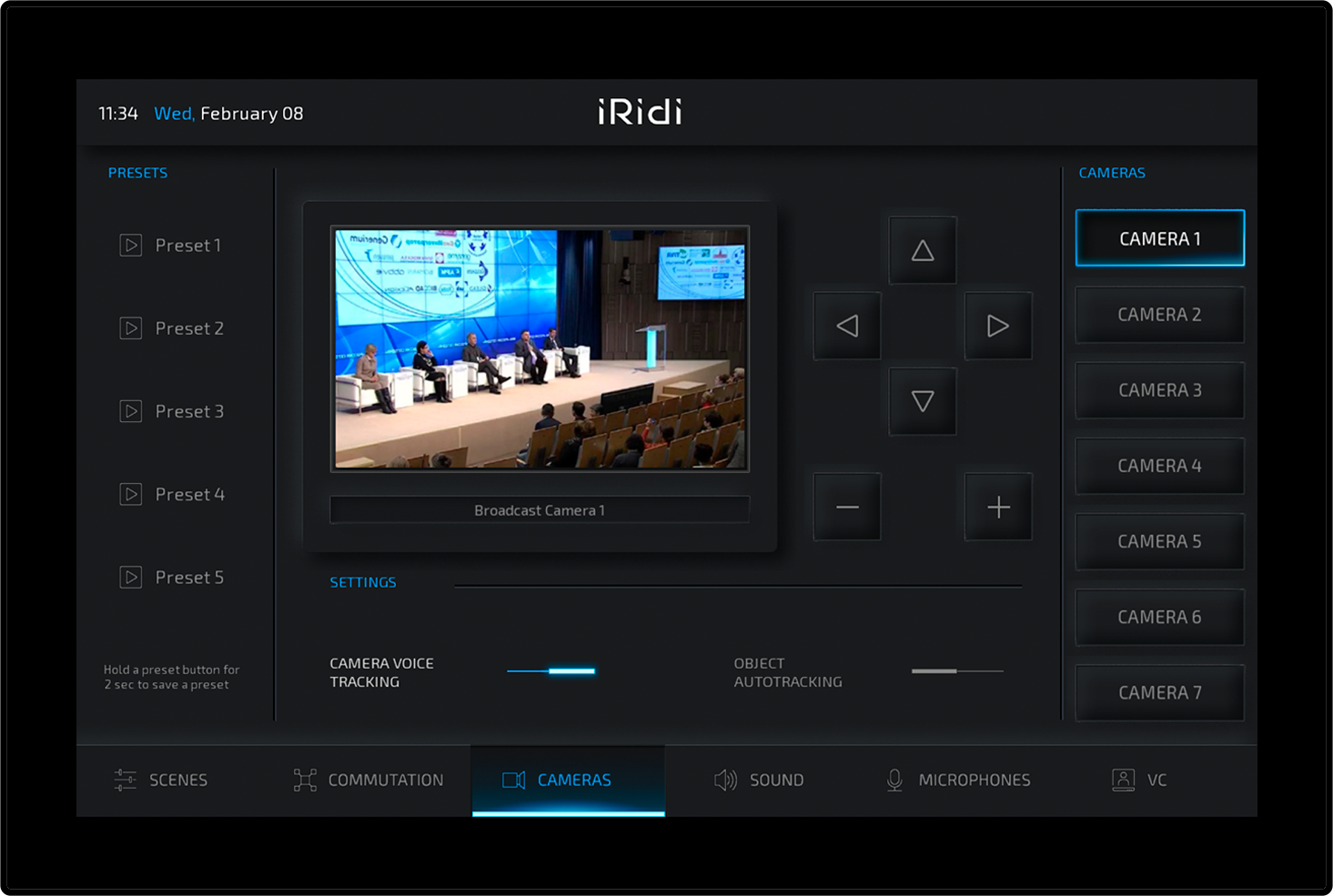 «AV-interface» is an interface in a contemporary style. It is designed especially for situational and congress centers, classrooms and other projects using audio and video equipment. It is implemented in dark colors for ease of operation in low light conditions.