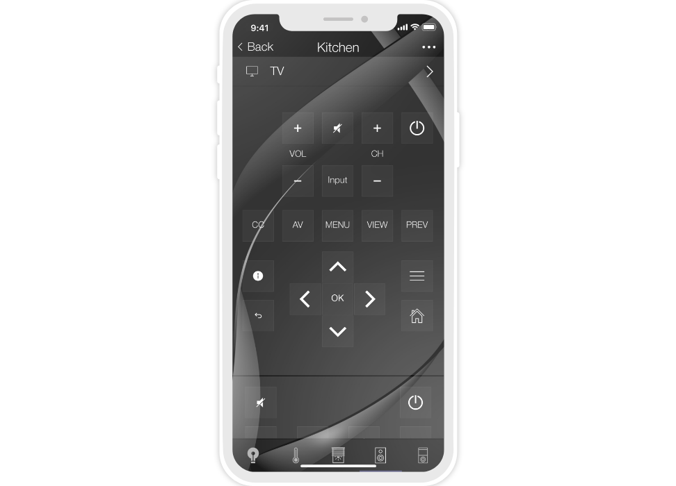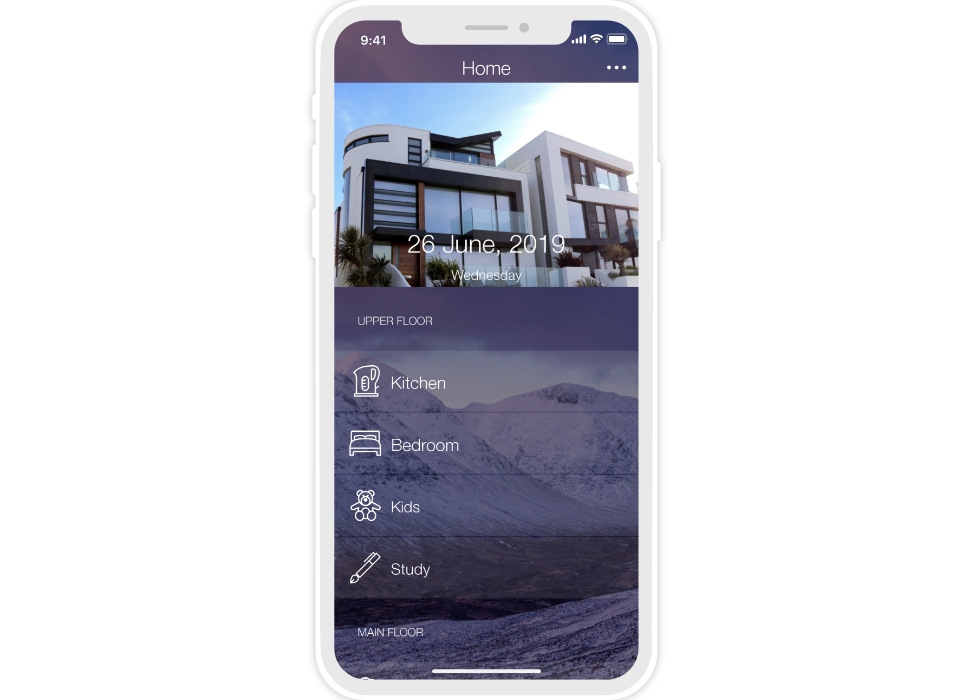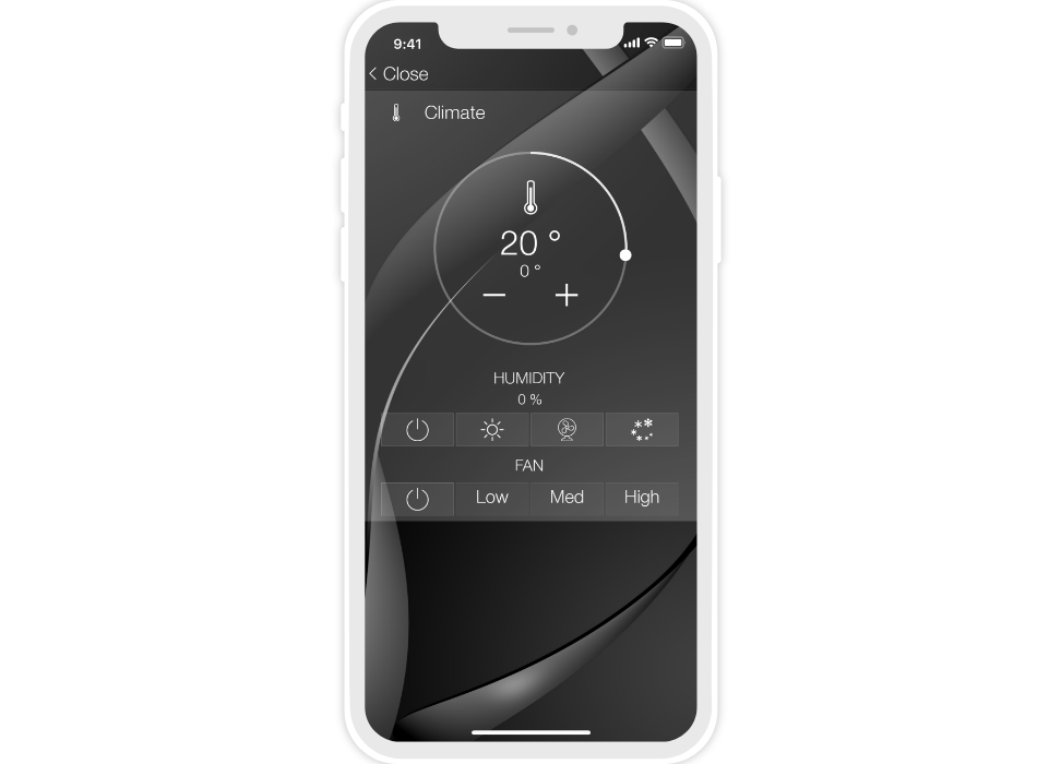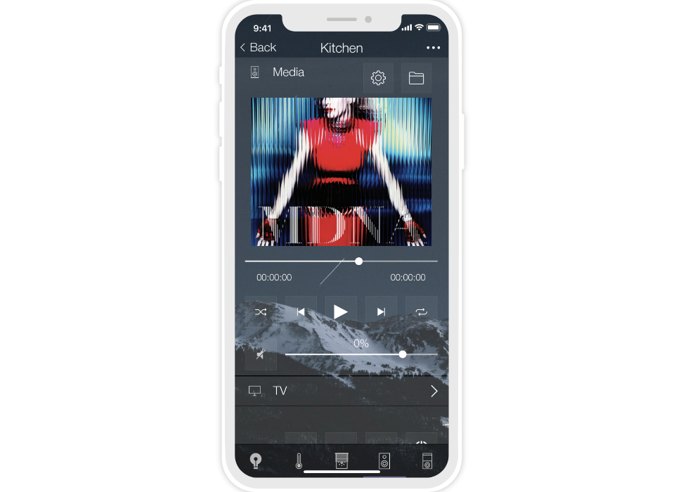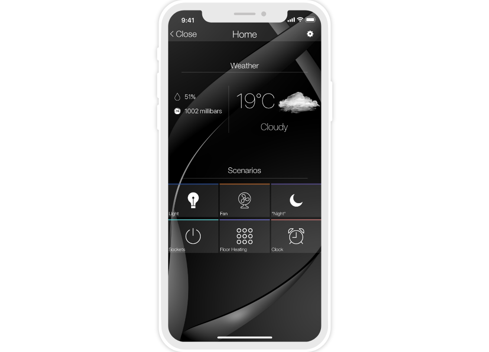 «Flex» is a dark semi-transparent style with a background image. There are 10 backgrounds to select from, but your own image can also be used. Thanks to the change of backgrounds (consequently the color) the interface can suit the design of any apartment or house.
