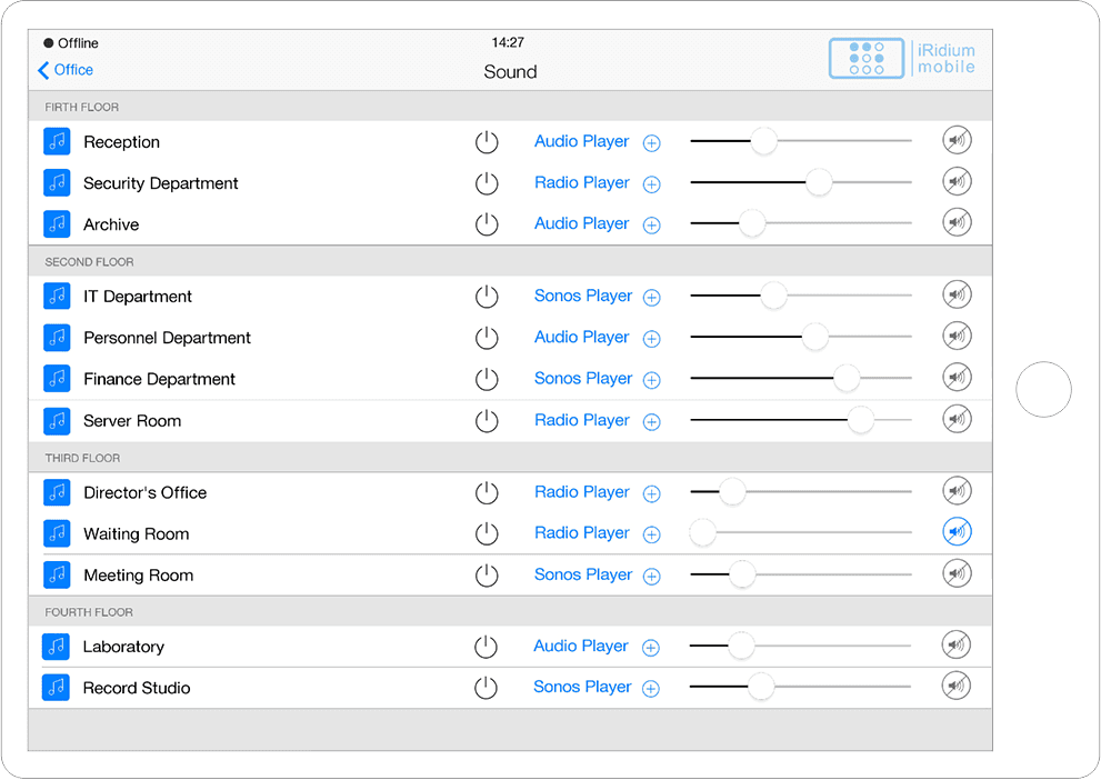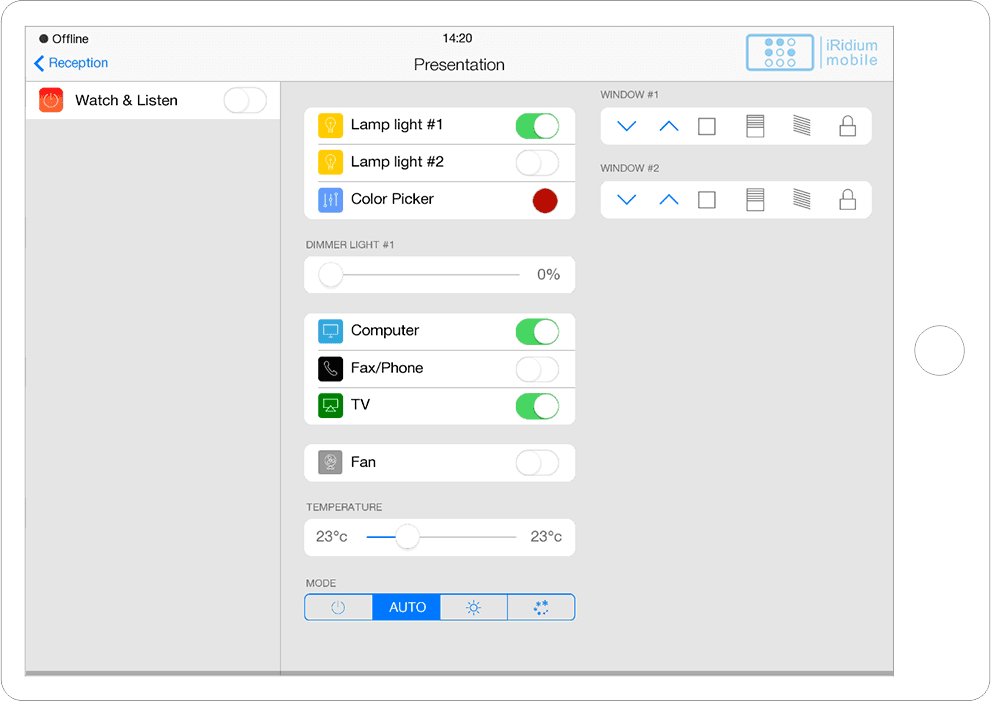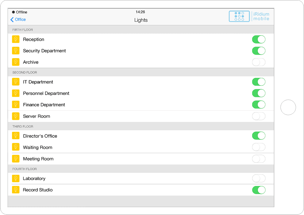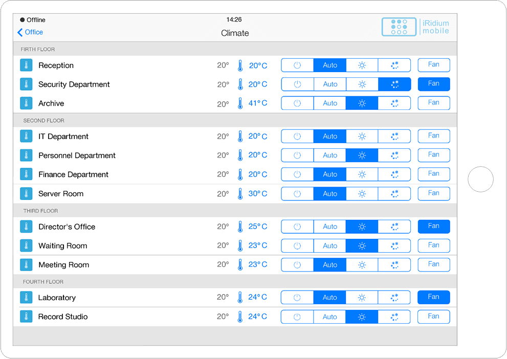 Interface in the easily recognizable and beloved iOS style with a variety of graphic items to control all A/V and automation equipment of smart offices, hospitals, etc.