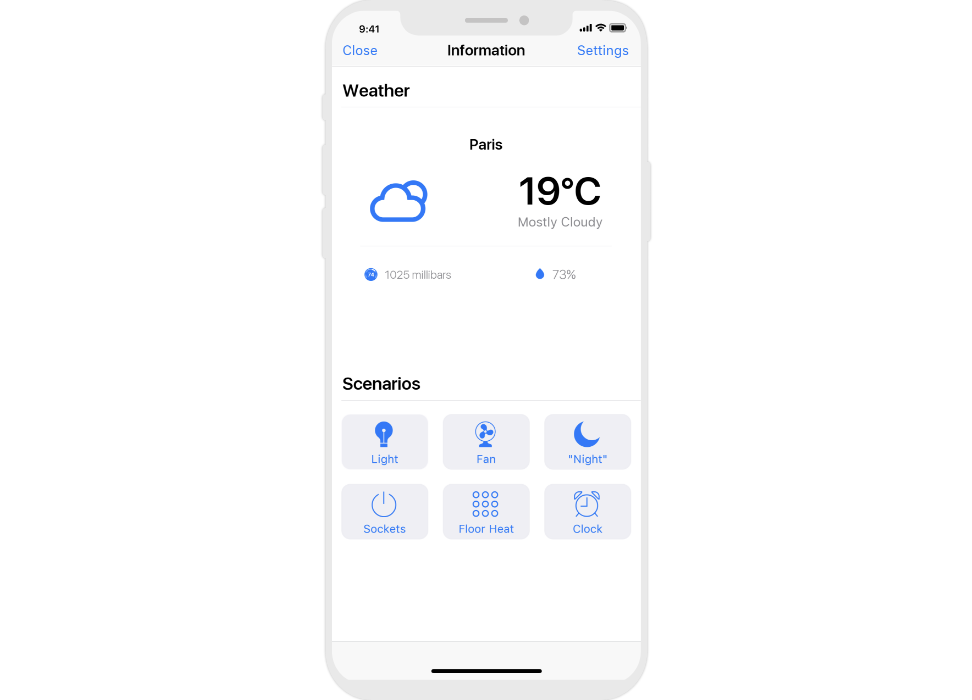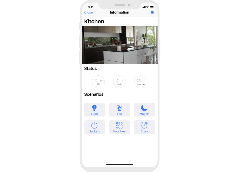info blocks of temperature, humidity, CO2 level in rooms;