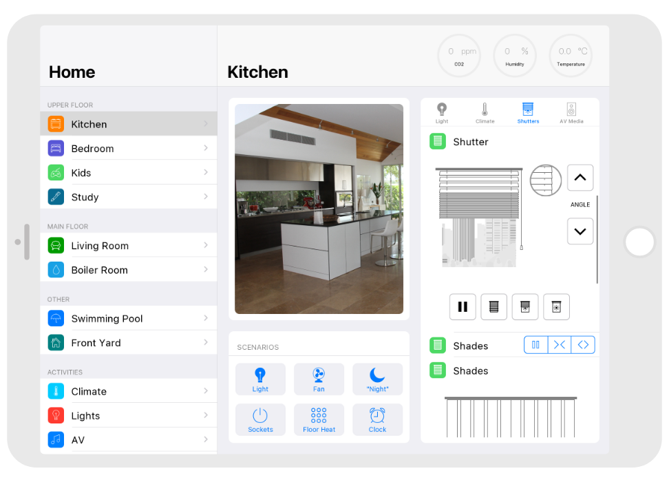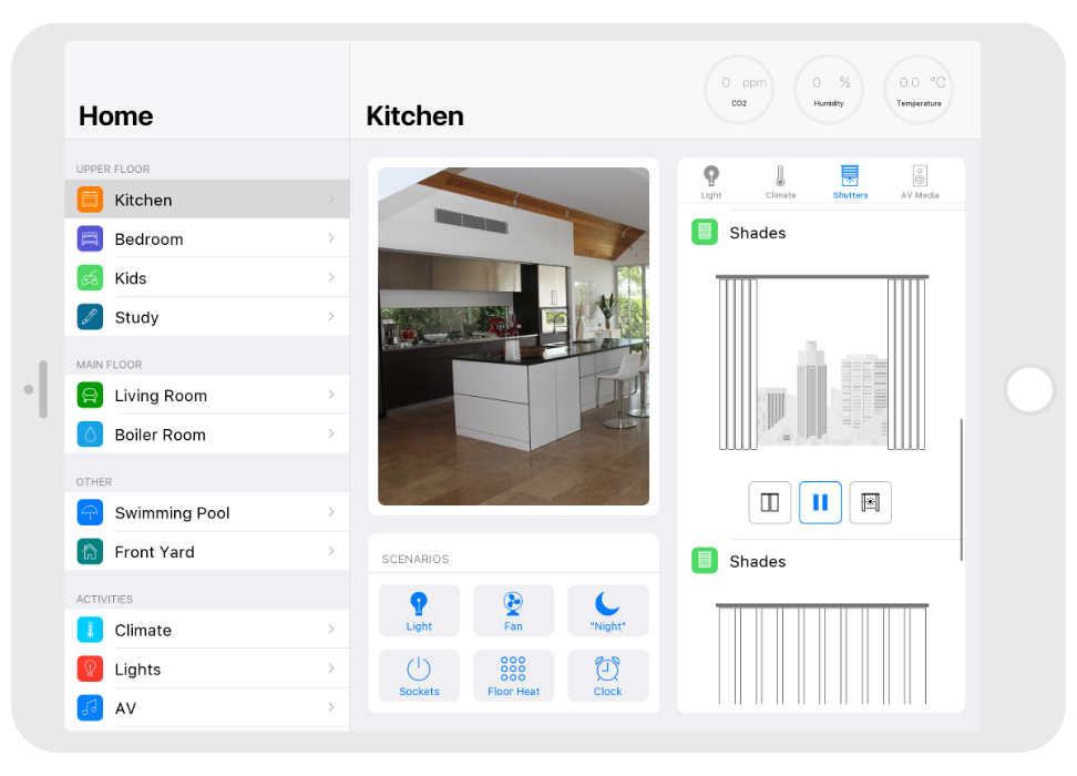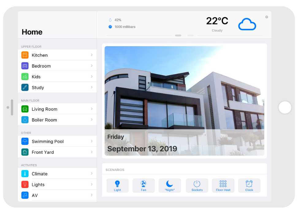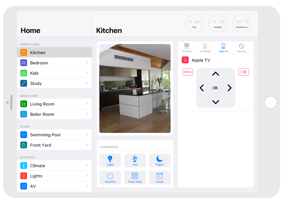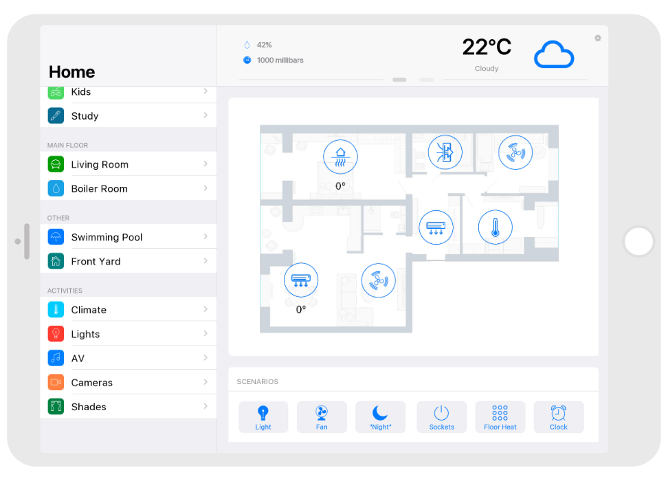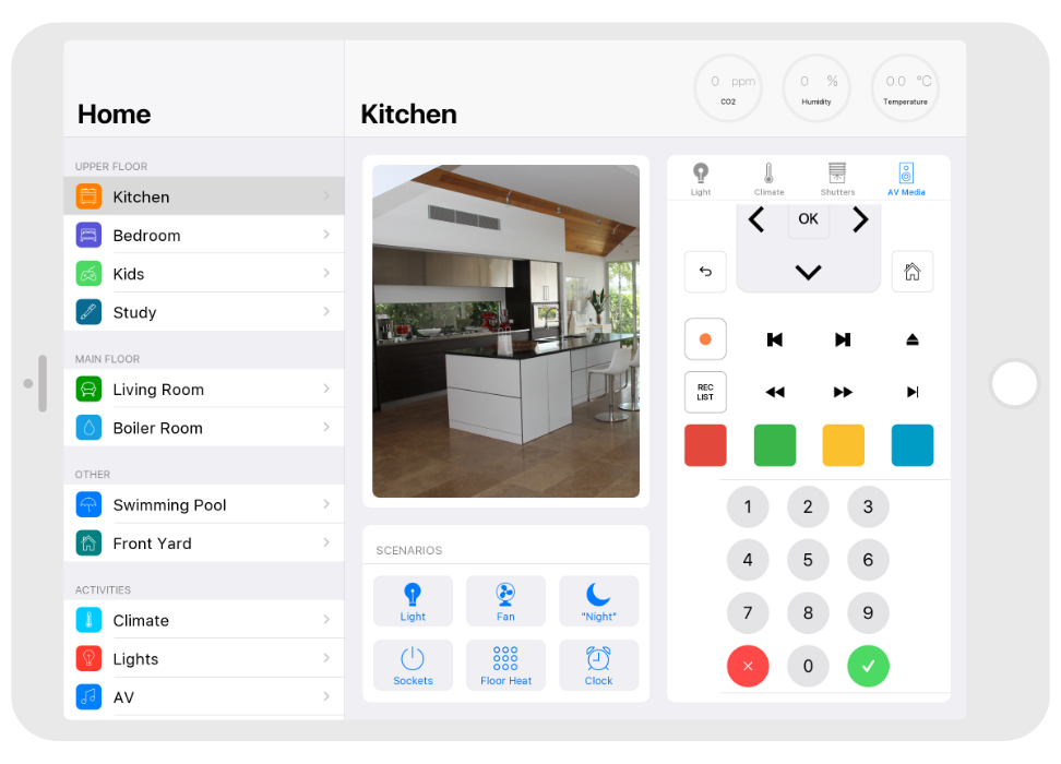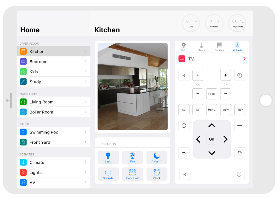Control: light. blinds, cameras, climate, control of Audio/Video equipment, scenes.