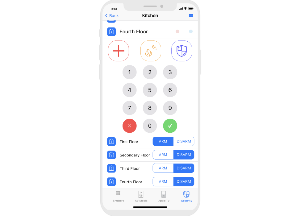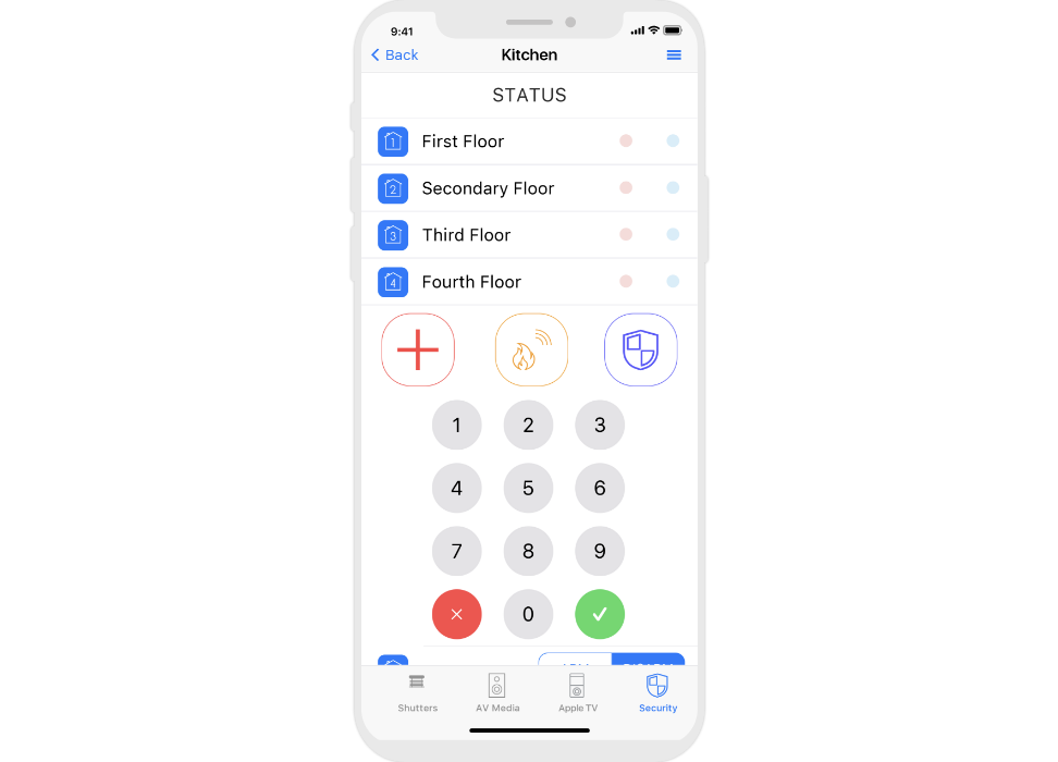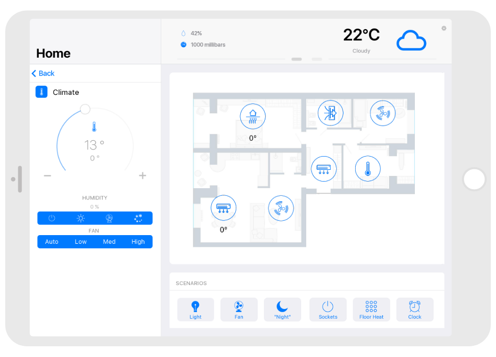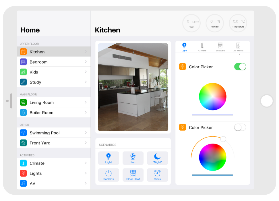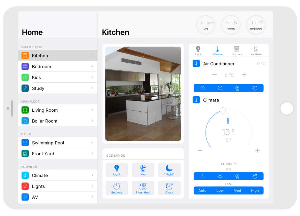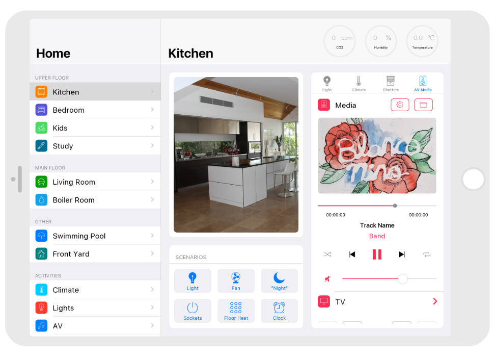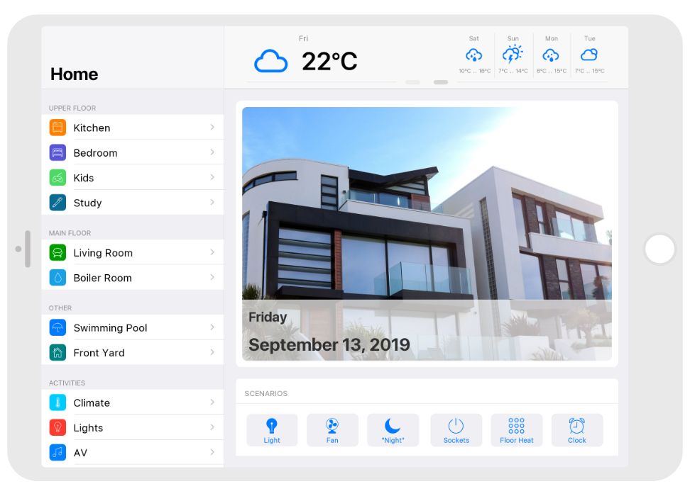 Control: light. blinds, cameras, climate, control of Audio/Video equipment, scenes.