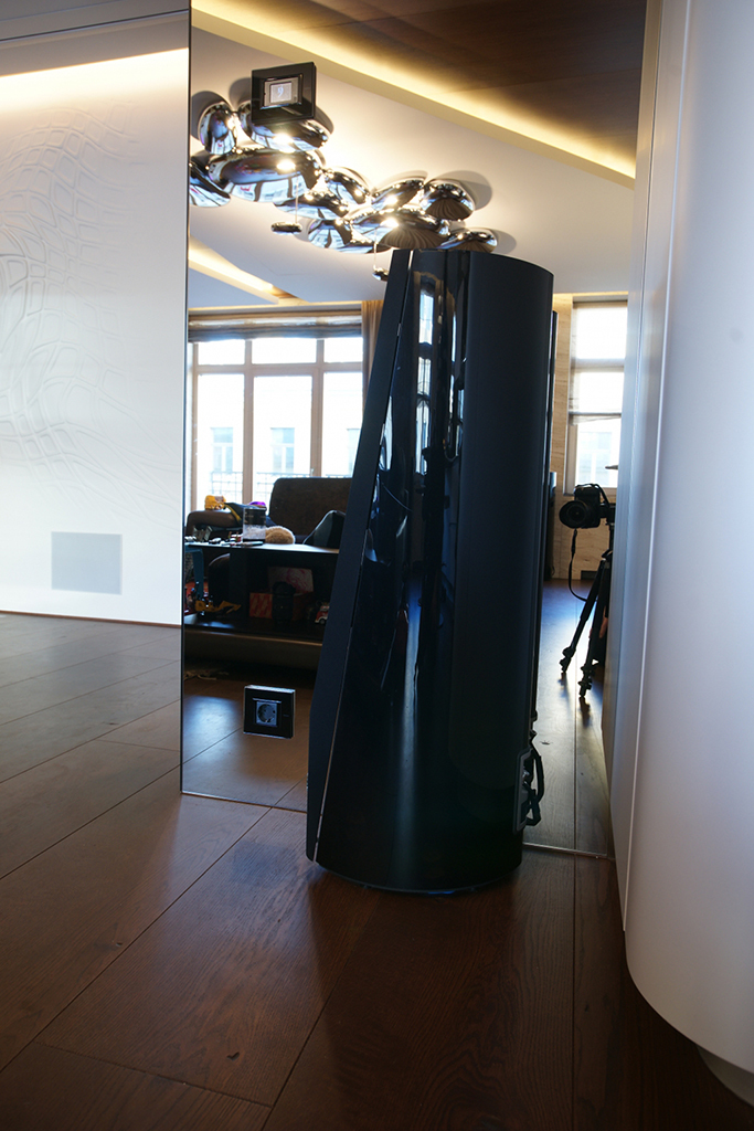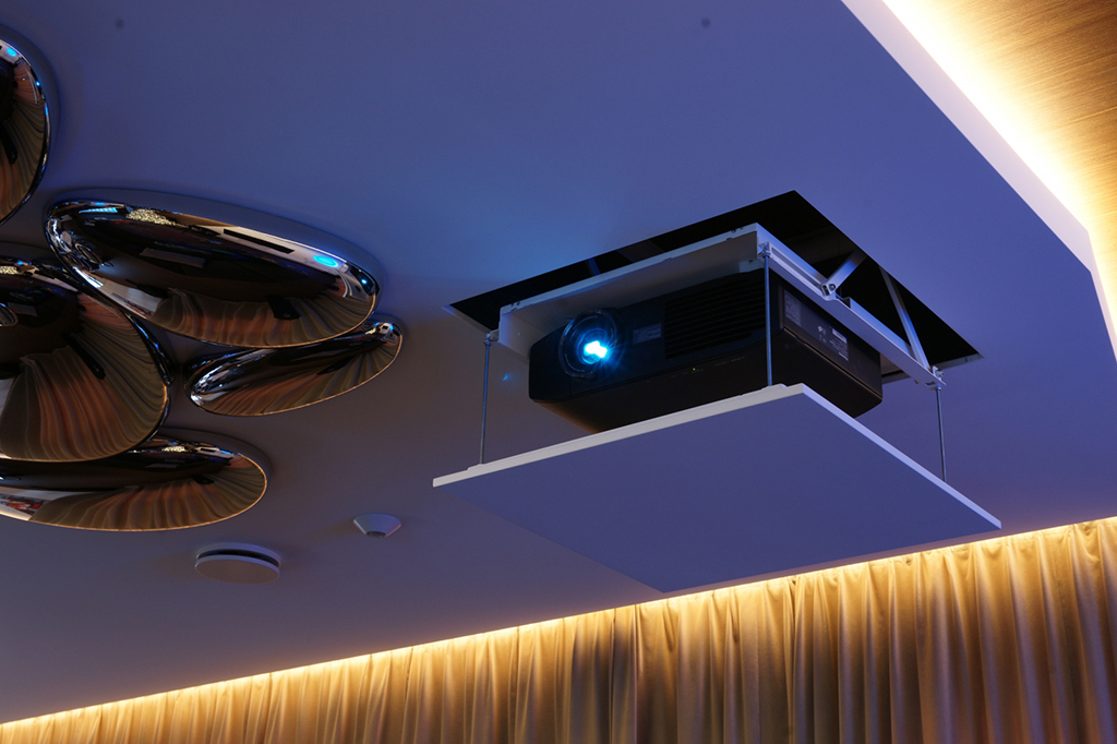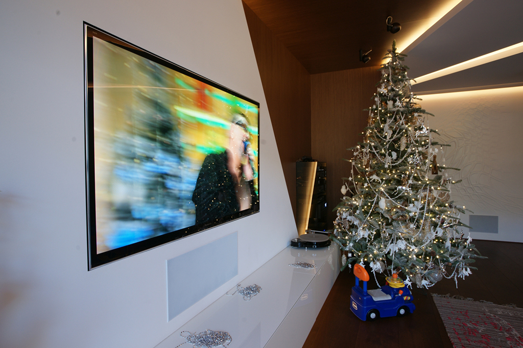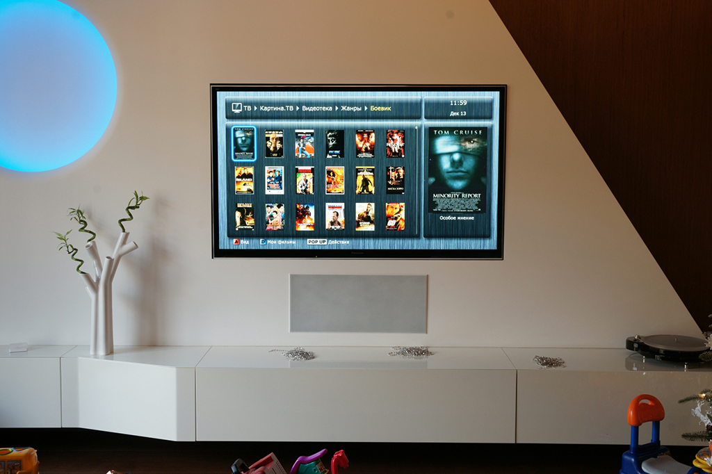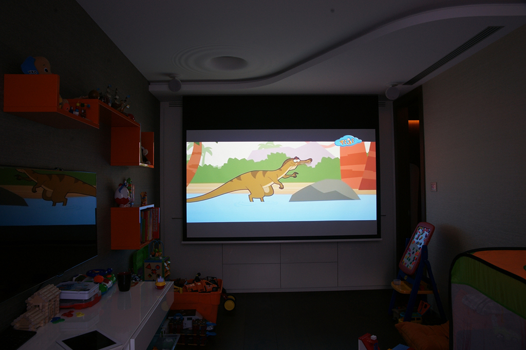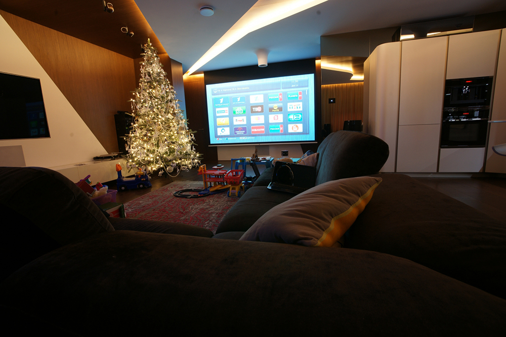 To solve the problem of “turning” the home cinema system in the sitting room, as the plasma panel and the projection screen face each other..