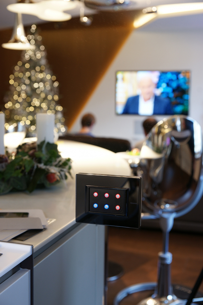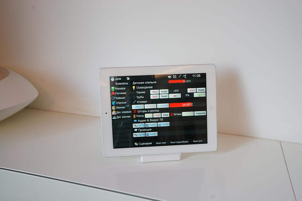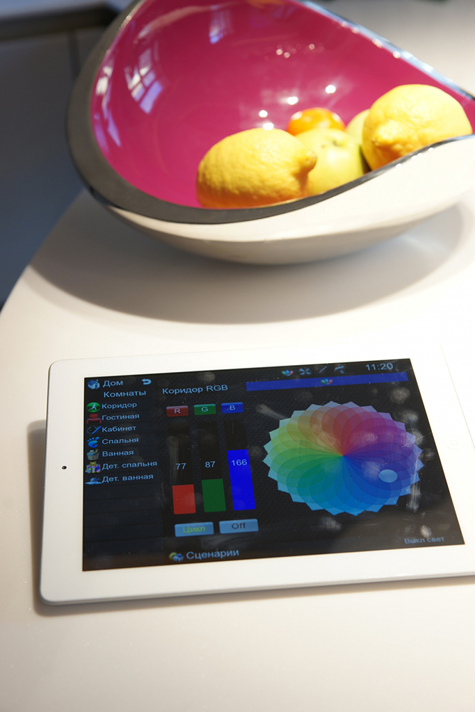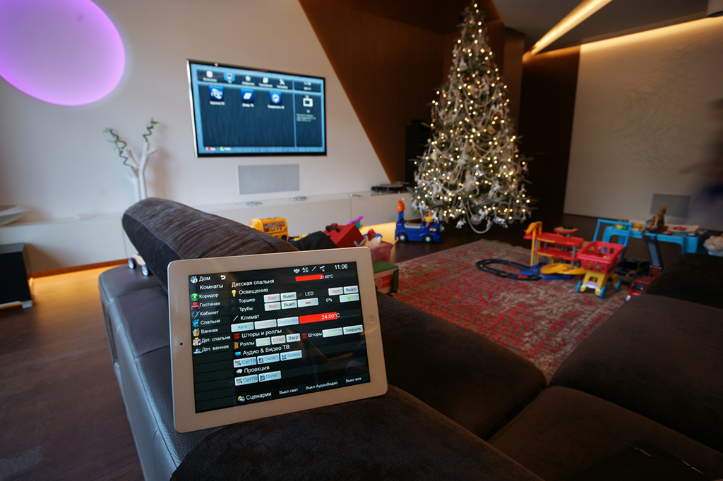 The task was to organize centralized control and monitoring of the engineering systems of the house, i.e. lighting, RGB lighting, heating, control of activators, ventilation and conditioning systems, video surveillance, Audio/Video equipment, leakage control, local Ethernet.