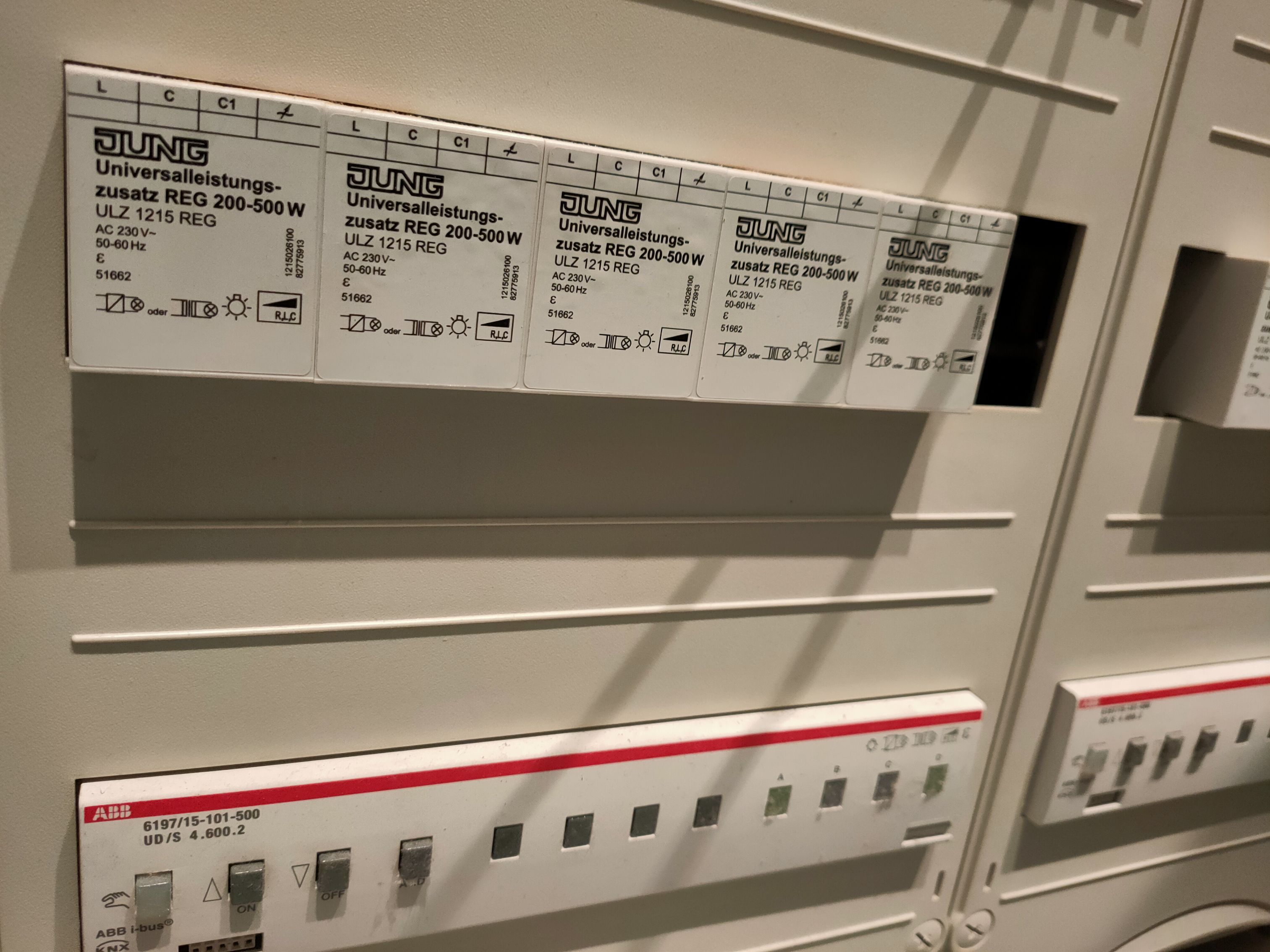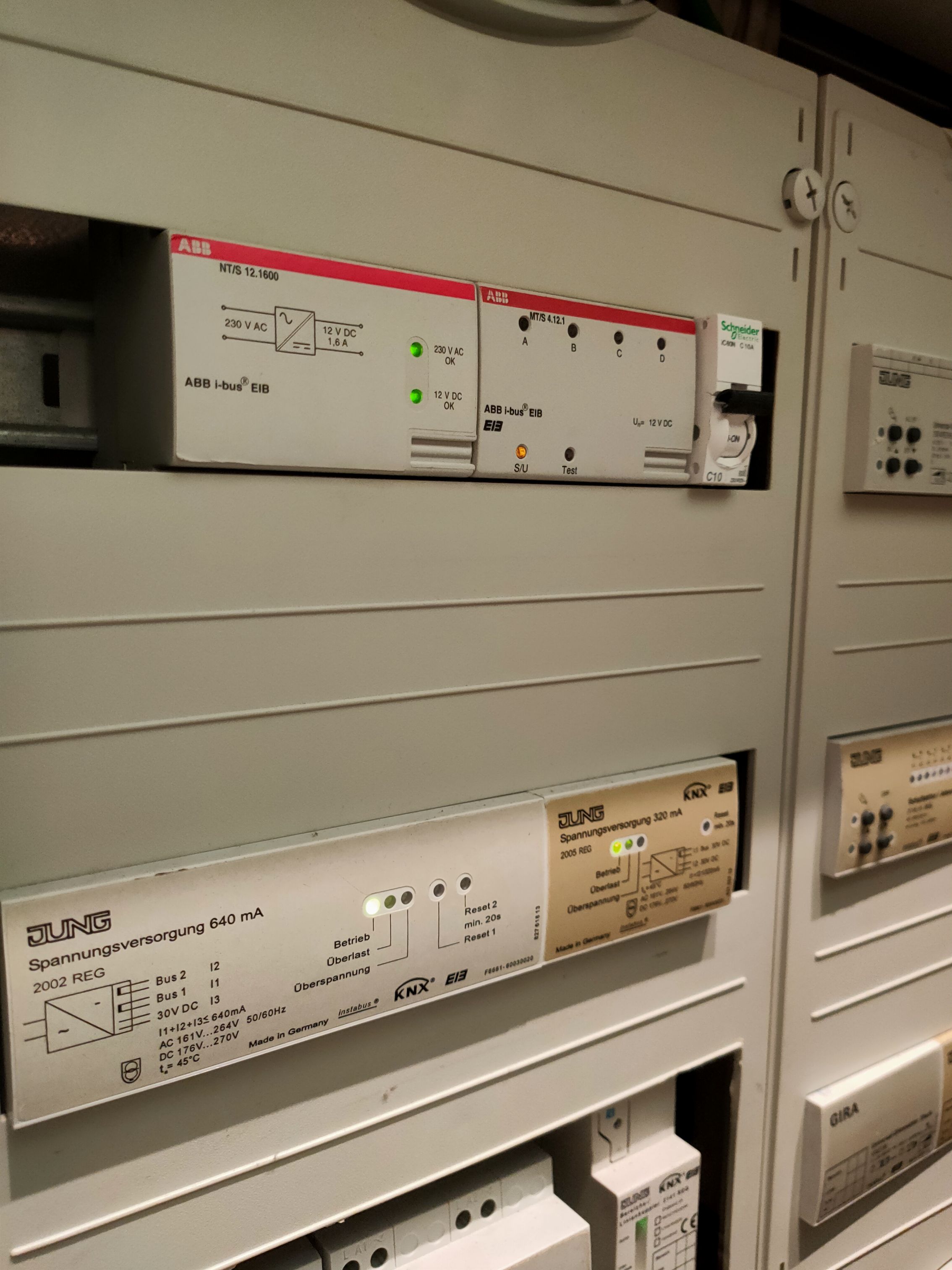The automation switchboard includes KNX equipment by different manufacturers (ABB, Zennio, Jung) to control light, blinds, warm floors and conditioners.