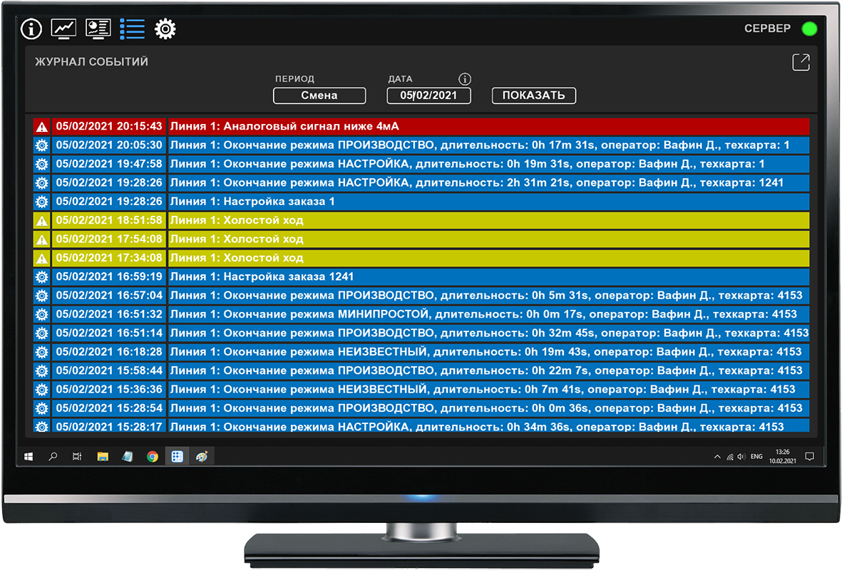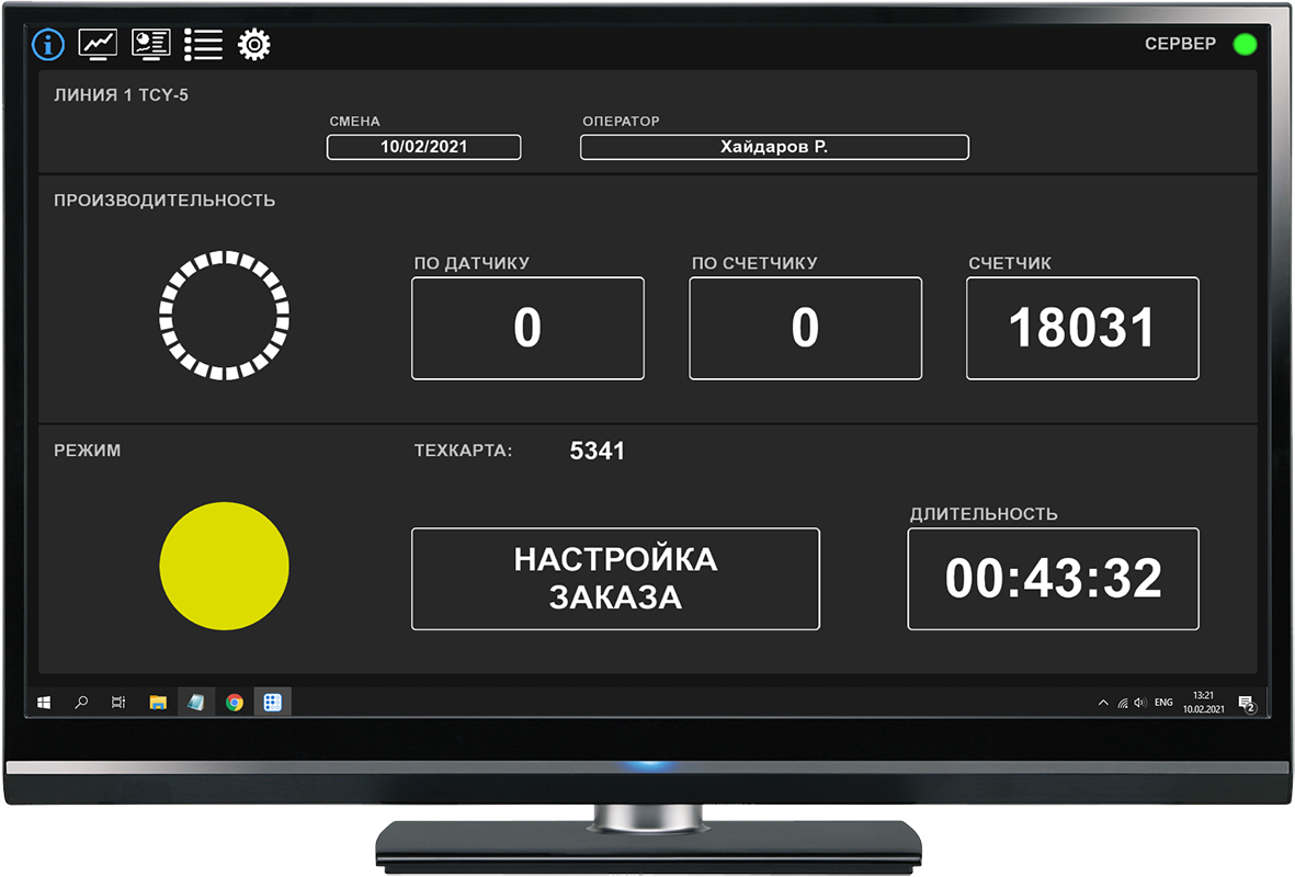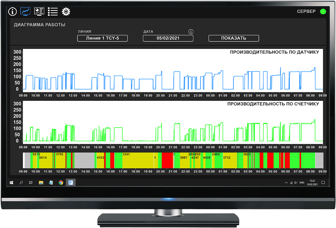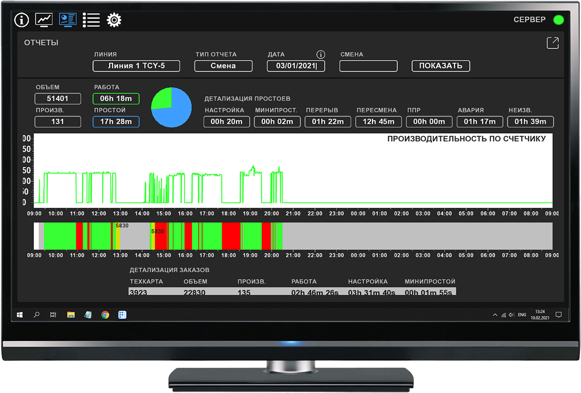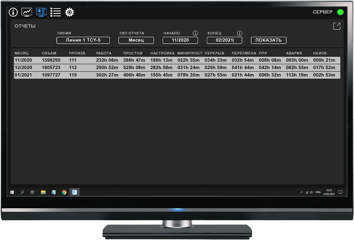 The system is designed for a corrugated board plant and allows you to monitor the condition of production lines, as well as generate various reports to analyze production efficiency.