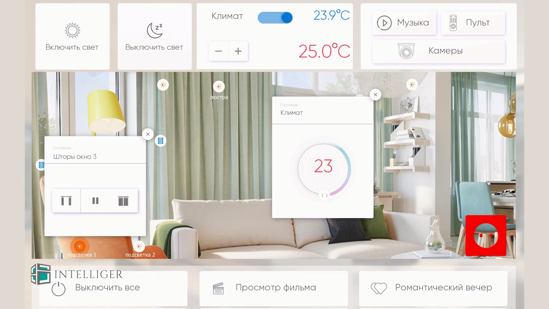It’s an automation system on the basis of KNX protocol in a 3-room apartment. The automation system includes control of light, climate, blinds, music, TV-sets, a security system. A control interface is connected with all functions of Smart home, providing full control of the system both locally and remotely.