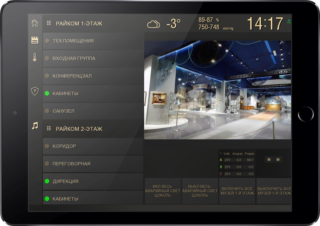 • On PCs of the security system and the head engineer of the museum – operation control of light modes, temperature/humidity in the exhibition halls and storages, emergencies;