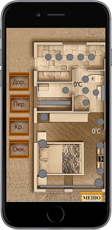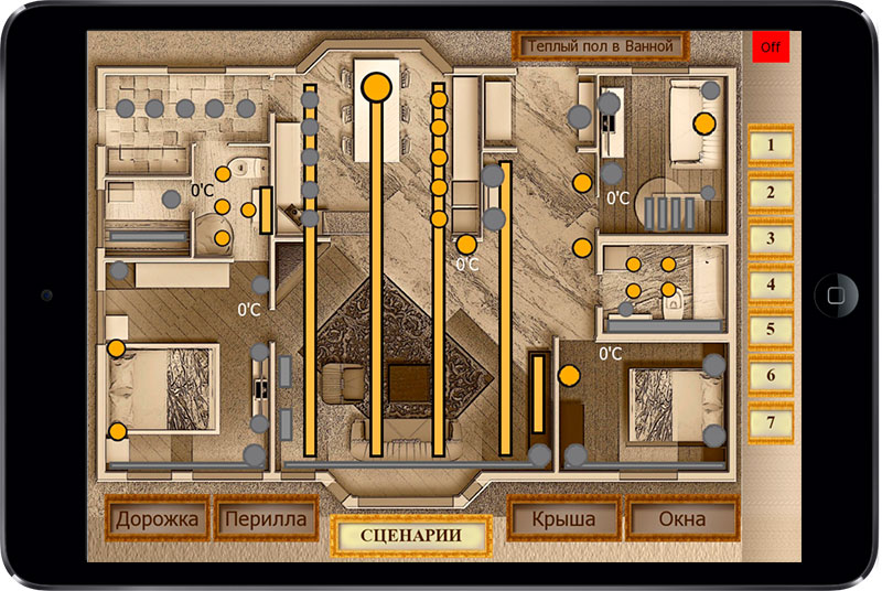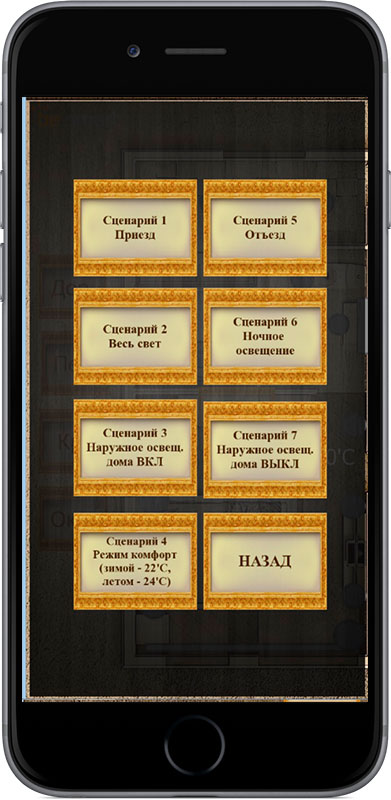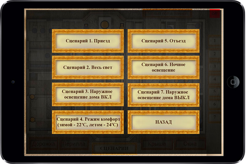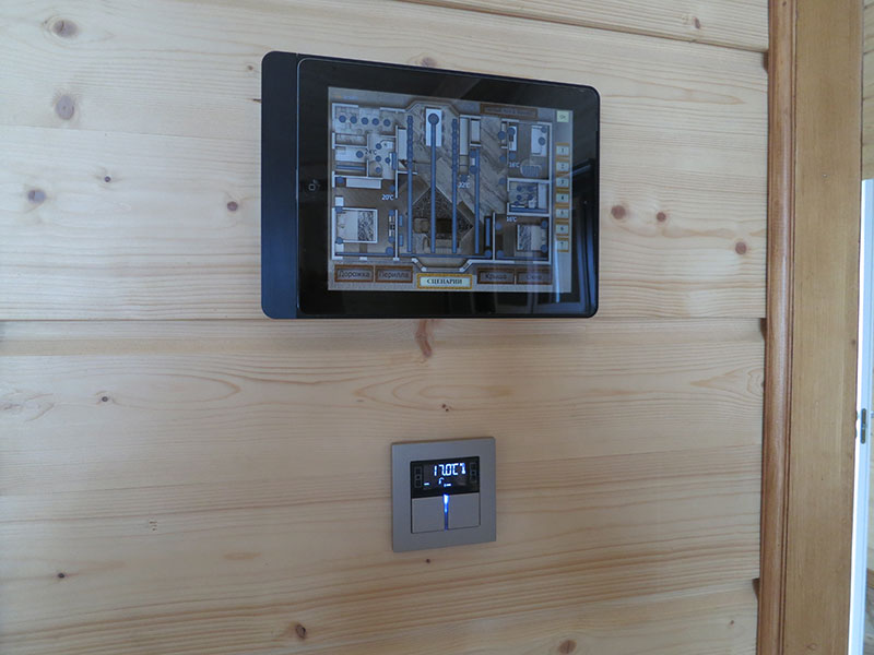 The main task was to use the KNX equipment left by the previous integrator and build the sutomation system with control of light (including the lighting of the house front), conditioners, rafiators and floor heating. It was also required to anticipate remote control of all house systems (for example, for increasing the temperature in the rooms before the arrival of the hosts).