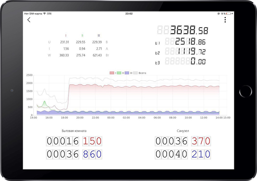 Data from meters of resource consumption and from the electrical meter are collected and displayed on control panels, charts of electricity consumption are created.