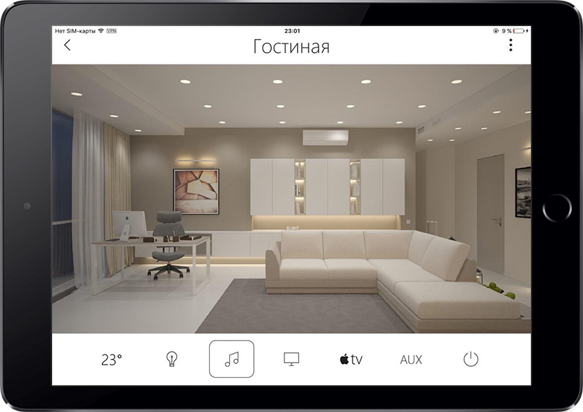 Complete automation of light control (simple change of scenes without programming), motion sensors must not be seen in the interior design, climate control (conditioners, input ventilation, electrical warm floors, exhaust fans), audio zones (including toilets). Creation of universal remotes for TV-sets, full accounting of resource consumption (water, electricity), including control of an automated door, installed in a tech room, into general scenes.