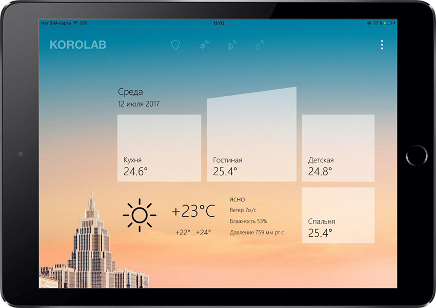 Coordinated control of 4 air-conditioners, ventilation, 5 heating radiators, an electric convector and 6 warm floors.