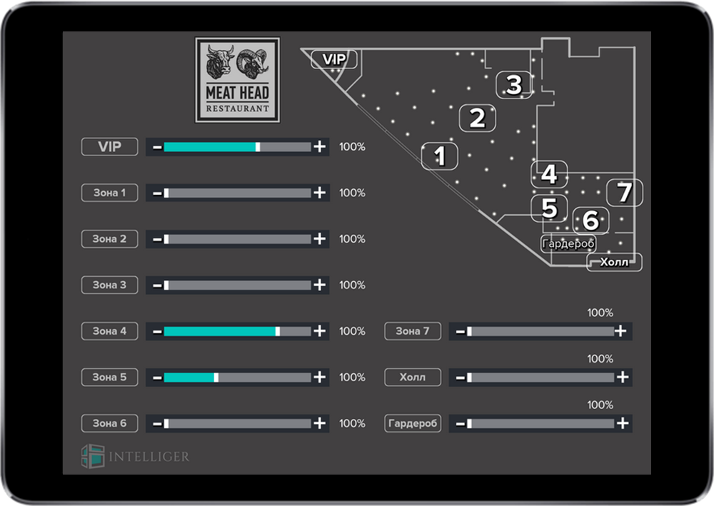Automation system that provides easy and convenient control of lighting was realized in the “Meat Head” restaurant. Several types of diod dimmers, controlled from a mobile app are used in the project. Besides, light scenes were created that can be launched both from an app and wall-mounted keypads.