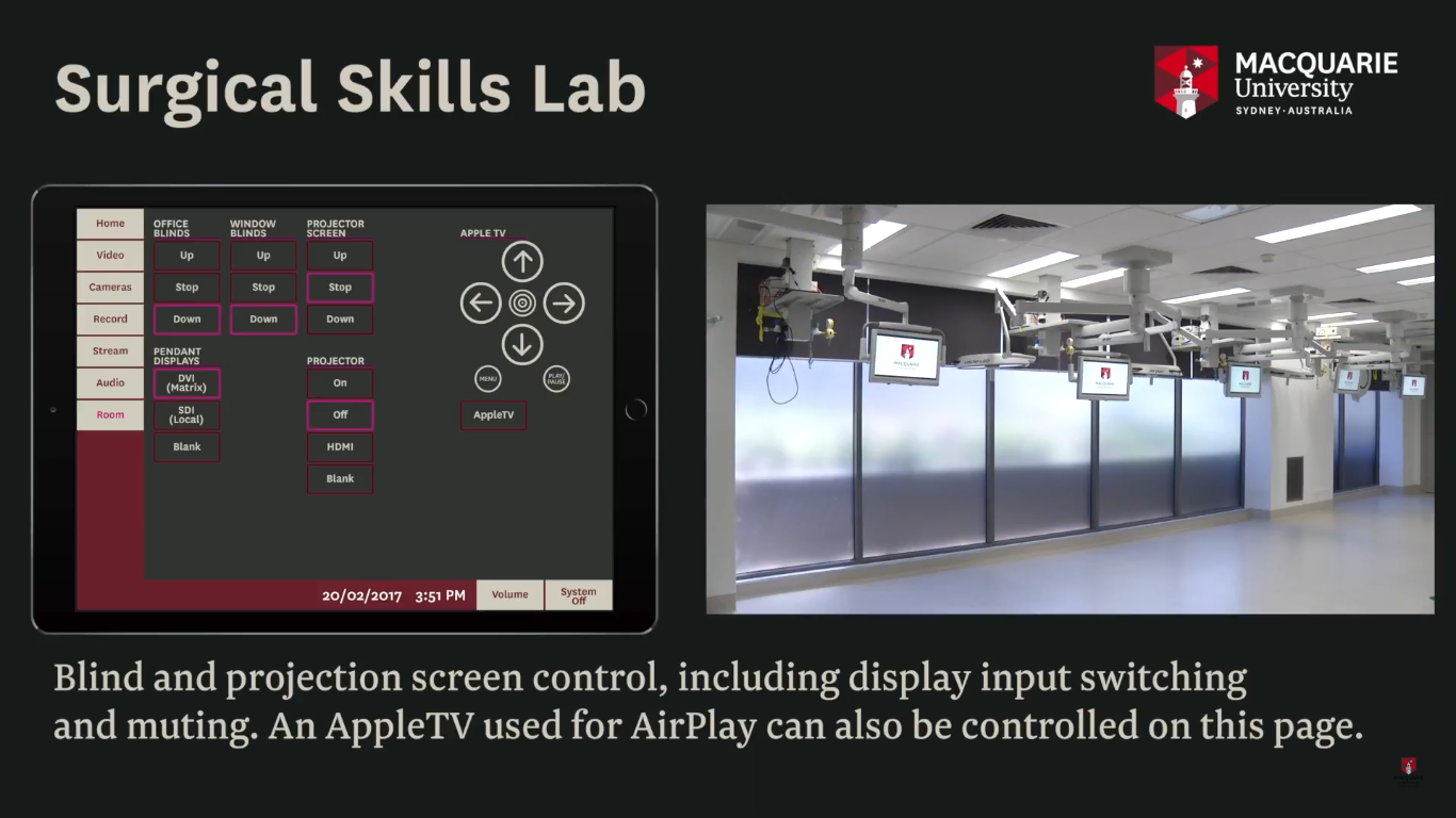 2x Dallmeier DIS-2M UTP Network Encoders 1x Extron MAV Plus 3232SV S-Video Matrix (IP Control) 1x Extron PIP 444 PIP Processor (RS232 Control) 2x Biamp Nexia CS DSP (IP Control) 2x Sennheiser IEM ewTransmitters (A & B Channels) 4x Sennheiser IEM Receivers (2x A, 2x B) 4x Behringer MA400 Headphone controllers 2x QSC RMX CX254 Amplifiers 6x Extron S126W In-Roof Speakers 4x Canon VCC-50i S-Video Cameras (RS232 Control) 1x NEC M46 Multeos LCD Display (RS232 Control) 7x Global Cache IP2SLP Controllers for RS232 1x Linksys 24 port POE gigabit switch (Control) 1x HP ProCurve 24 port POE gigabit switch (Campus Network) 1x Apple AirPort Express 2x iPad Pro 12.9” in Desktop Enclosure 4x Audio Technica ATH-BP-HS1 Headsets 2x PreSonus AudioBox 2x2USB 1x Laerdal SimMan 3G Simulation Mannequin 1x Laerdal ALS Man + SimPad Simulation Mannequin 4x Laerdal LLEAP Enabled PCs 2x HP 23” Touch Screens 2x HP 19” Displays 2x Dell 24” Displays (S-Video) 1x Stryker VisionElect 26” Medical Display Surgical Skills Lab