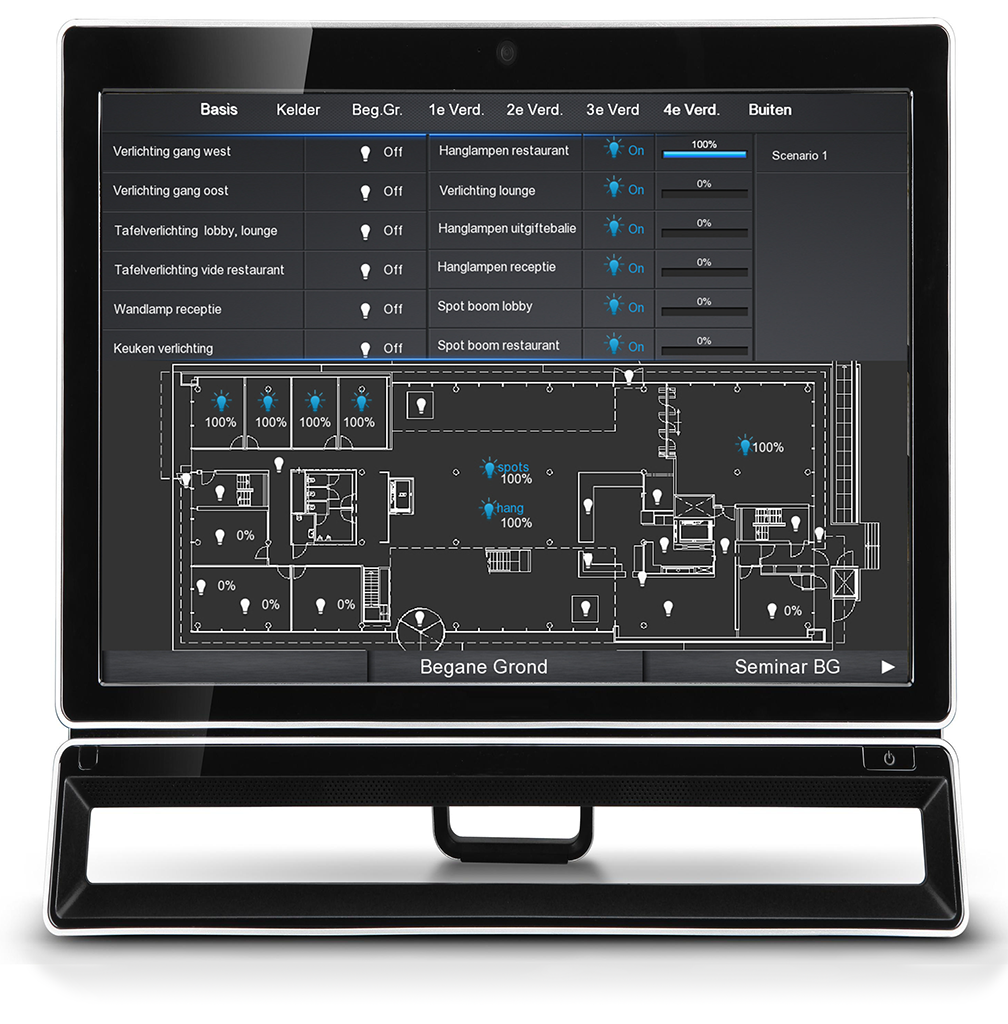 All these functionally must be controlled from a number of Touch PC’s, so different staff-members on different floors can control the complete installation.