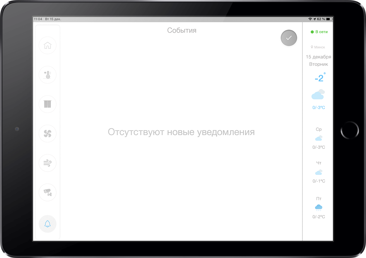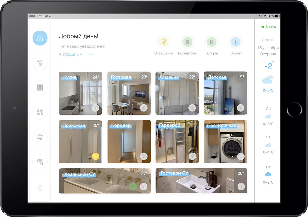 The customer wanted to control the lighting, floor heating, radiators, air conditioners, air quality in the apartment, air handling unit and have quick access to the cameras in the entrance. He also wanted to receive notifications from security sensors (leakage, smoke and motion sensors) and have a quick response of the automation system to emergency situations. It was important that the system worked according to scripts, but it was also possible to edit them and create new scripts.