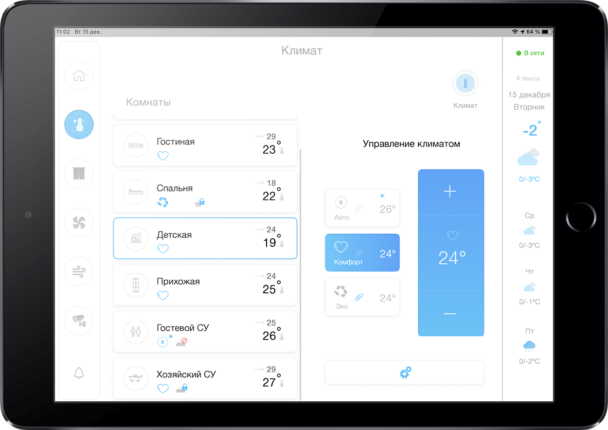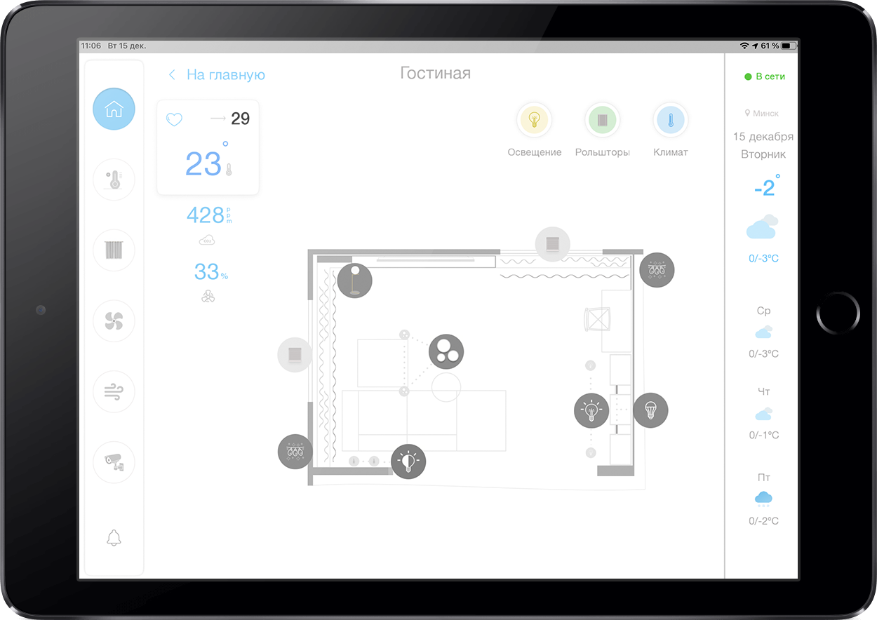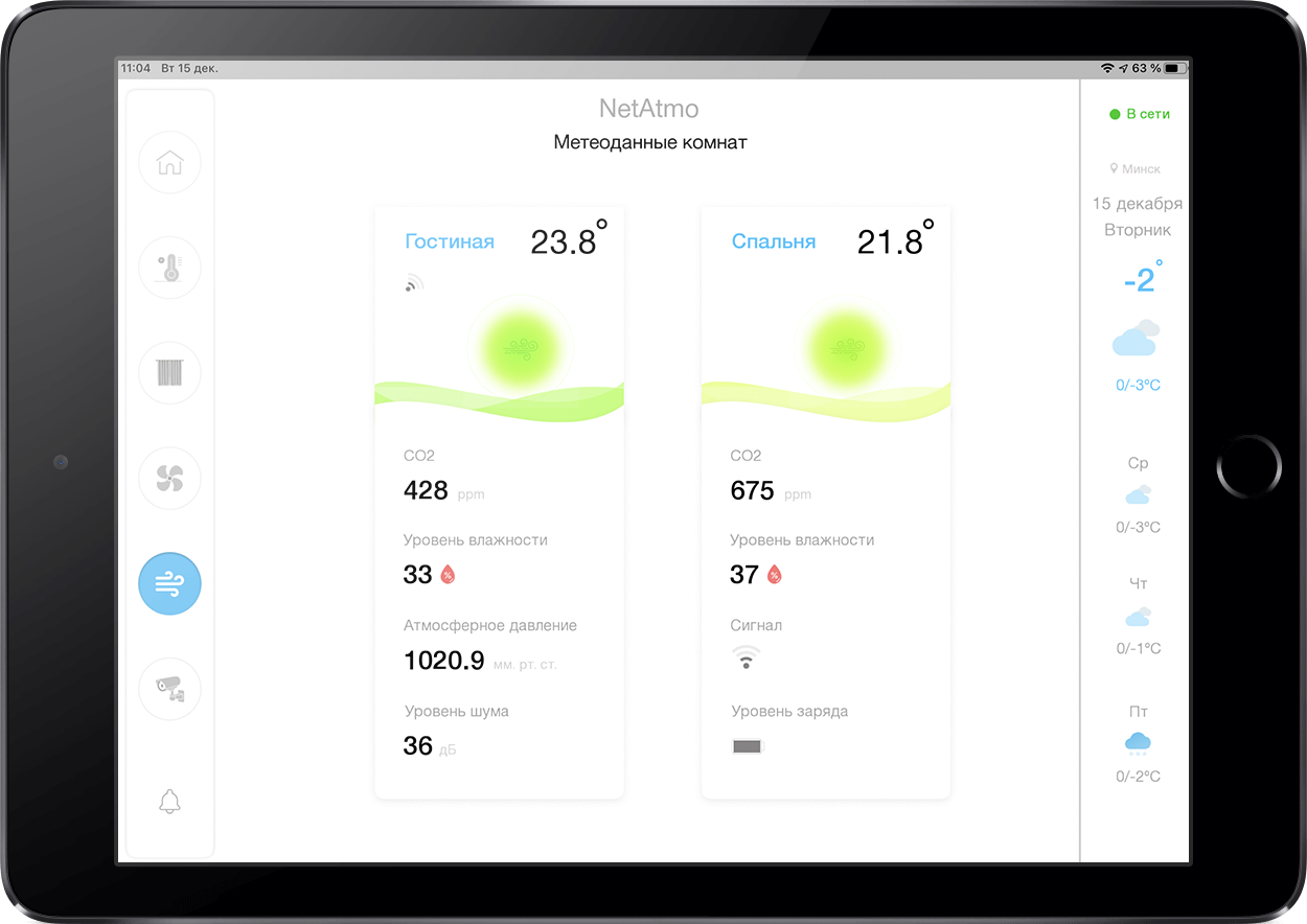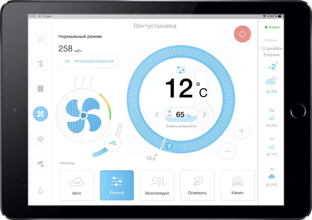 iRidium is used to combine all engineering systems into a single interface. Our company has been working with iRidium mobile for over 5 years and has already developed a large number of drivers for the integration of third-party equipment. In this project, we made our own JS driver for CO2 and humidity sensors - Netatmo (http).