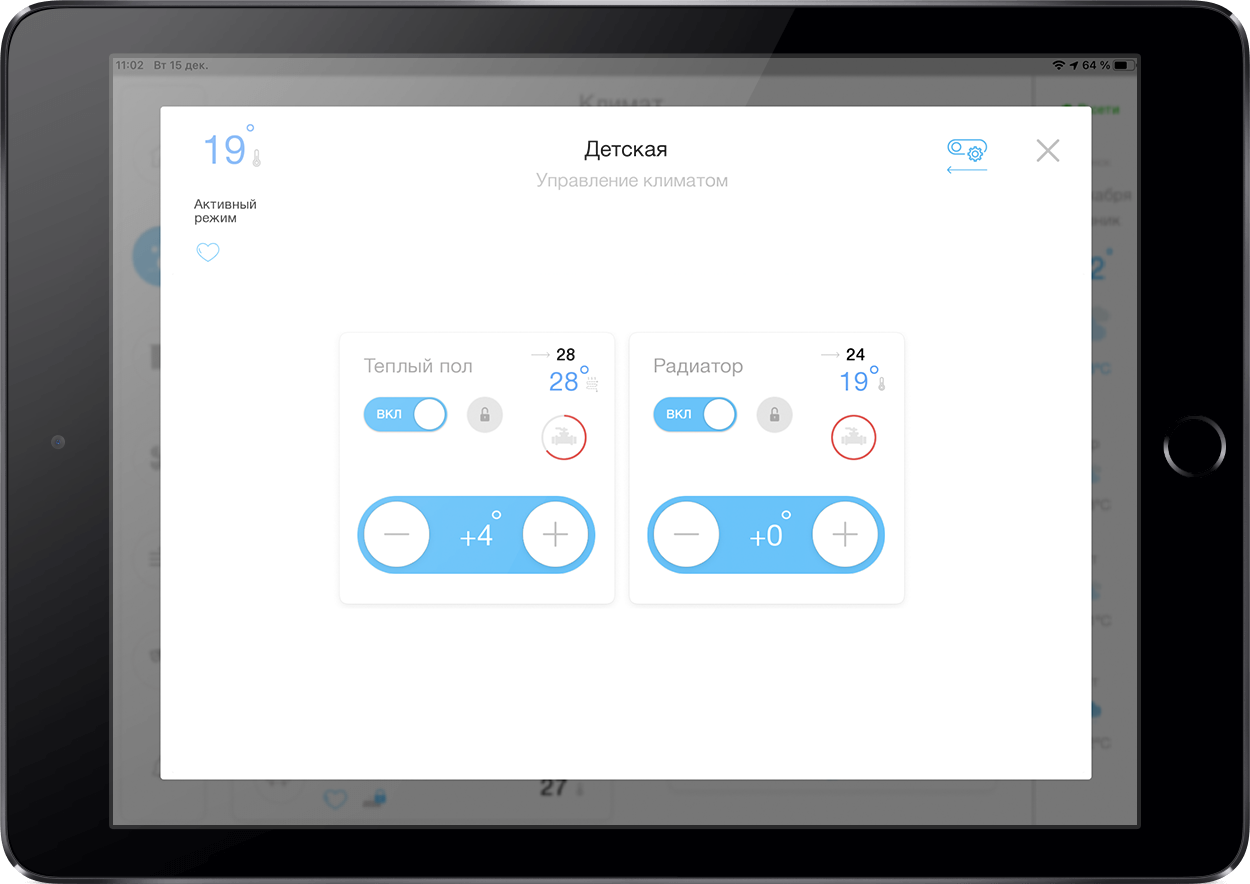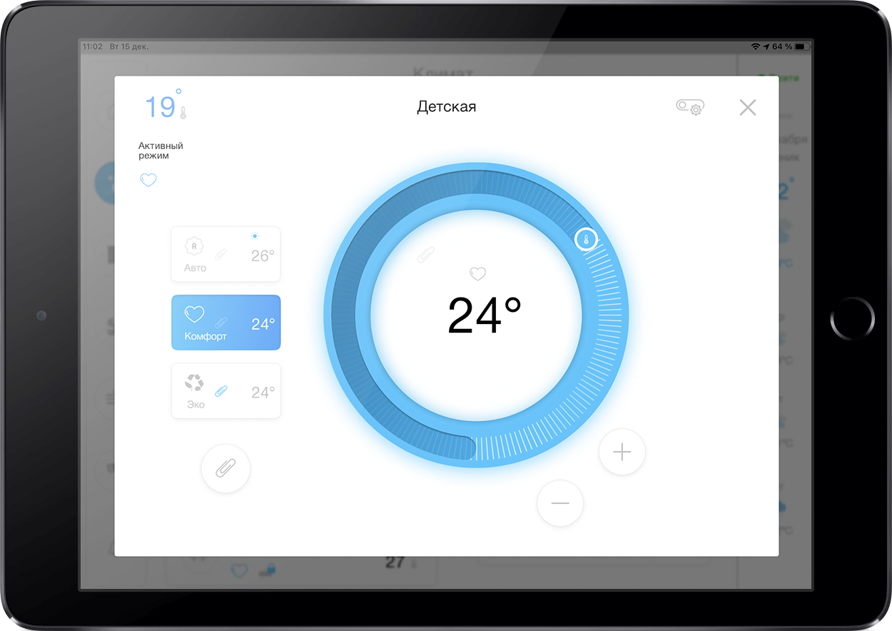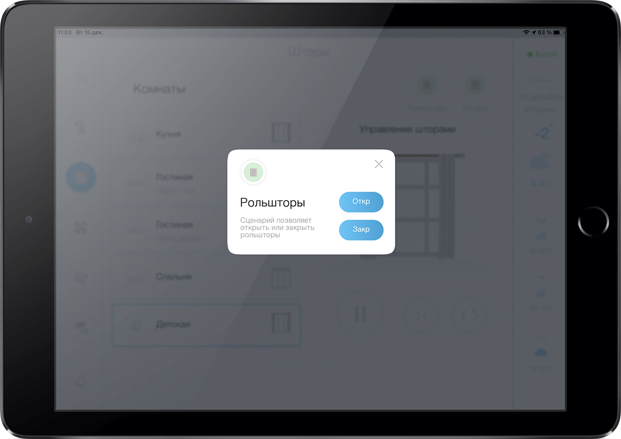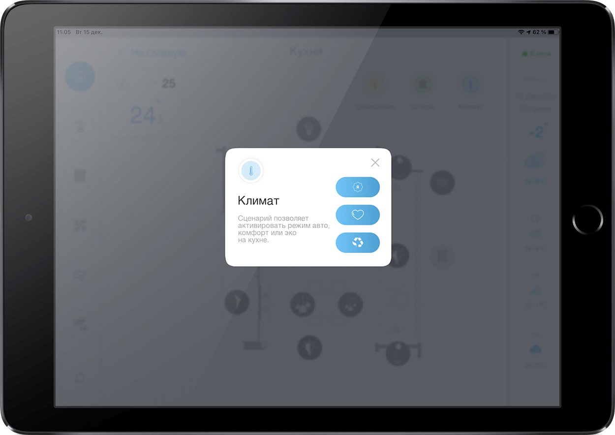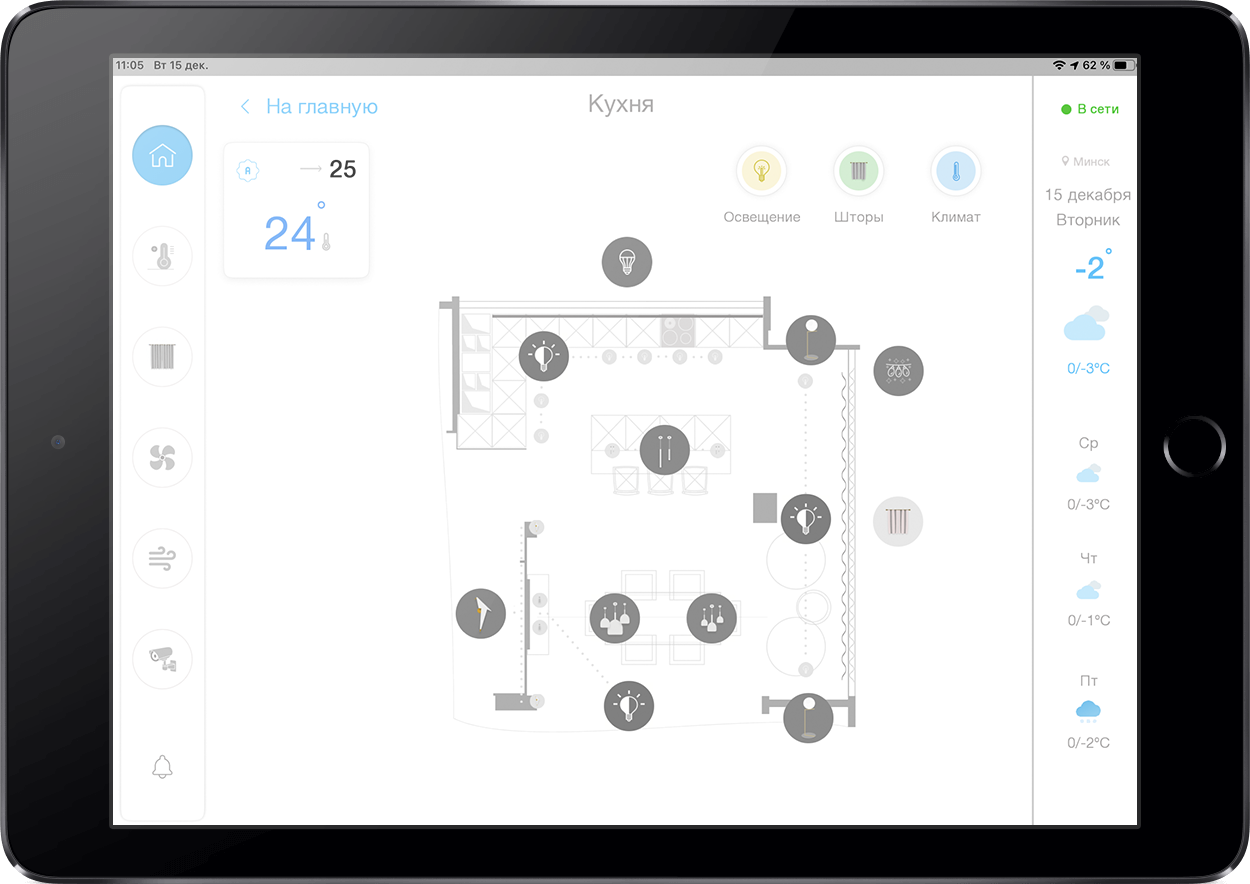 iRidium is used to combine all engineering systems into a single interface. Our company has been working with iRidium mobile for over 5 years and has already developed a large number of drivers for the integration of third-party equipment. In this project, we made our own JS driver for CO2 and humidity sensors - Netatmo (http).