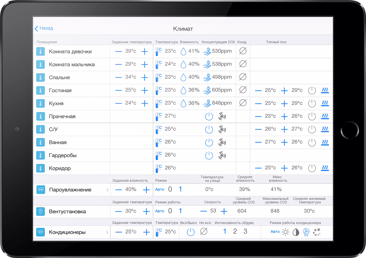 We use iRidium in our projects due to the possibility of creating flexible logic of interaction between almost any elements of the system. With UMC C3 server we implemented common logic of climate control system and separate devices on JS, scenes and schedules, push-notifications.