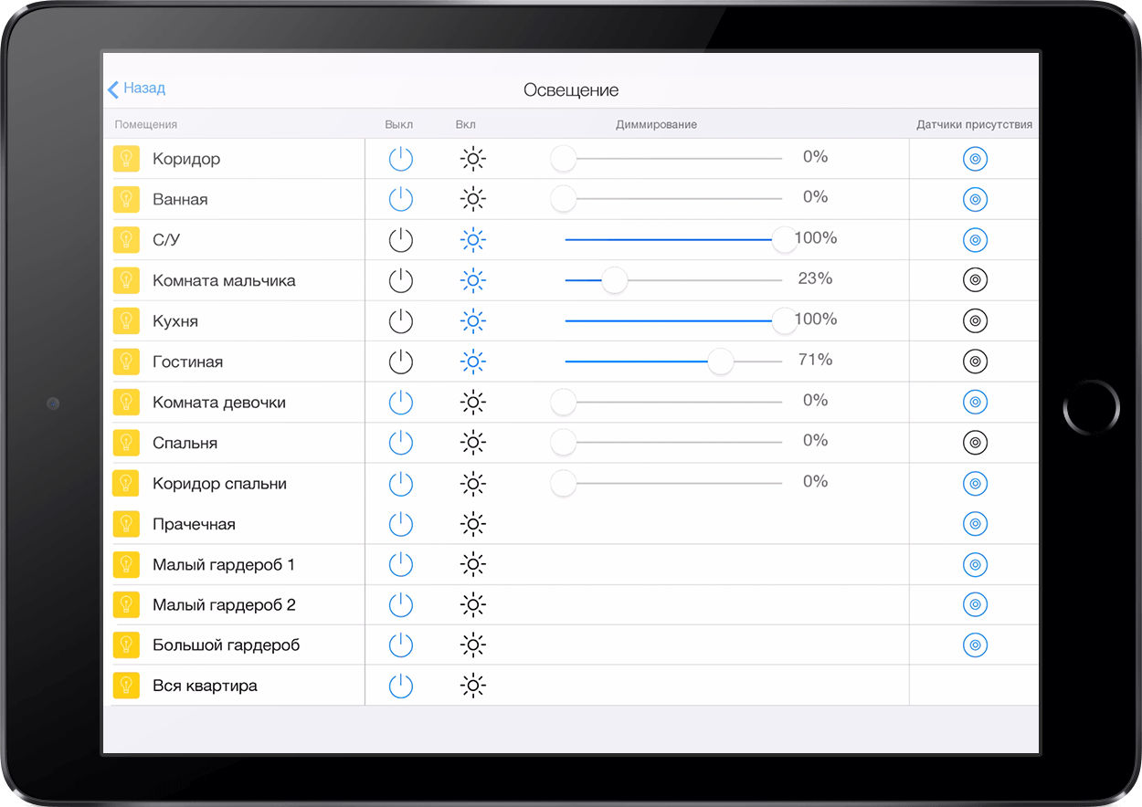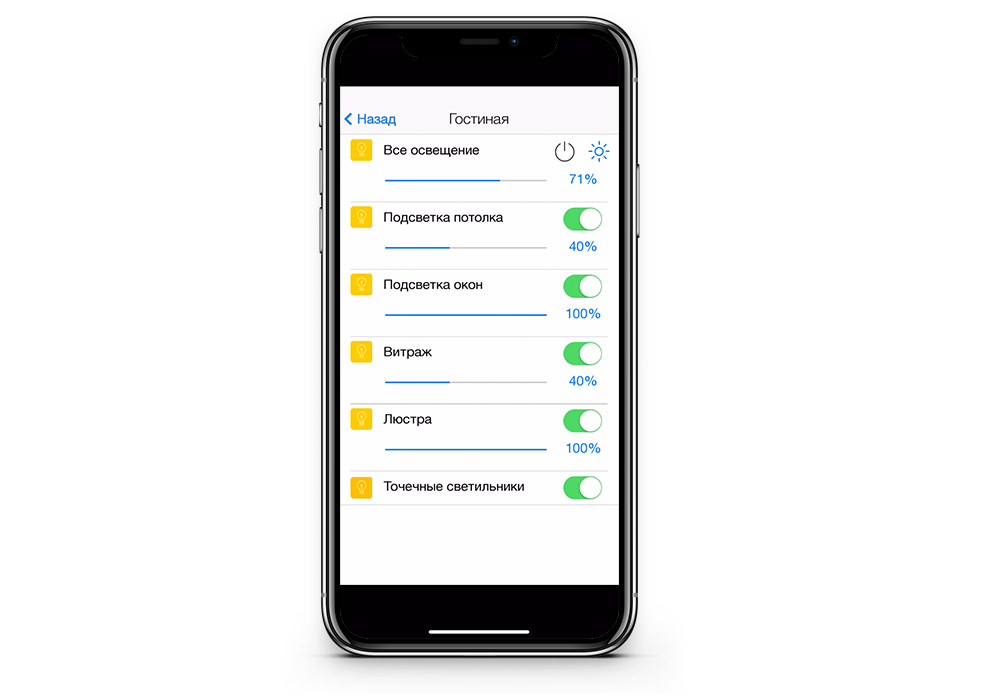 - lighting (dimming of lights and LED tapes, turning on/off spotlights, backlights and wall lamps);