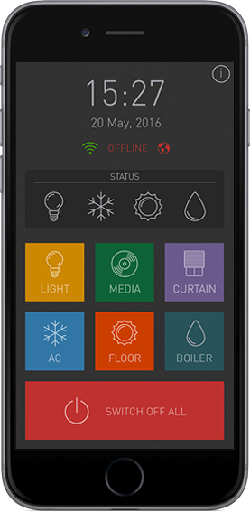 Control of lighting, warm floors, conditioners, A/V equipment, blinds, water boilers. Scenes to switch all off and to switch off separate functions.