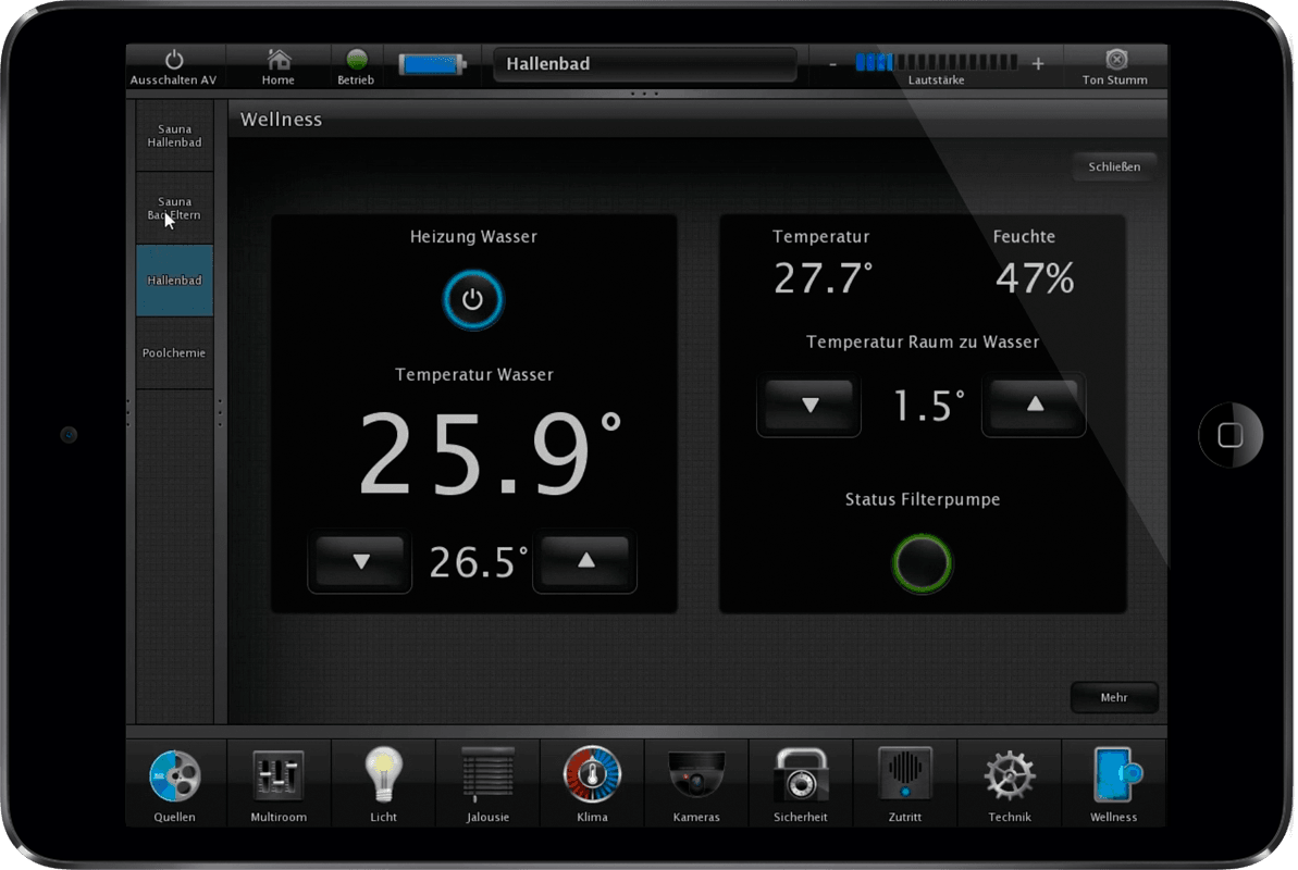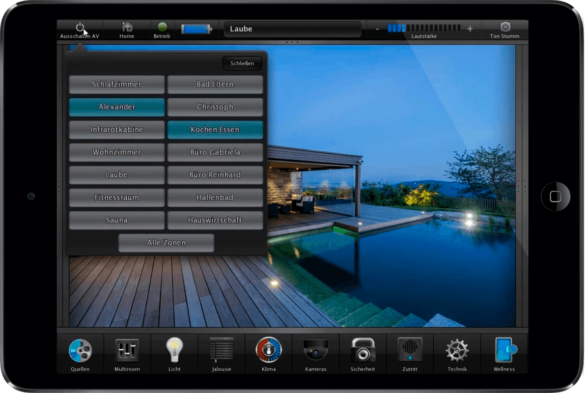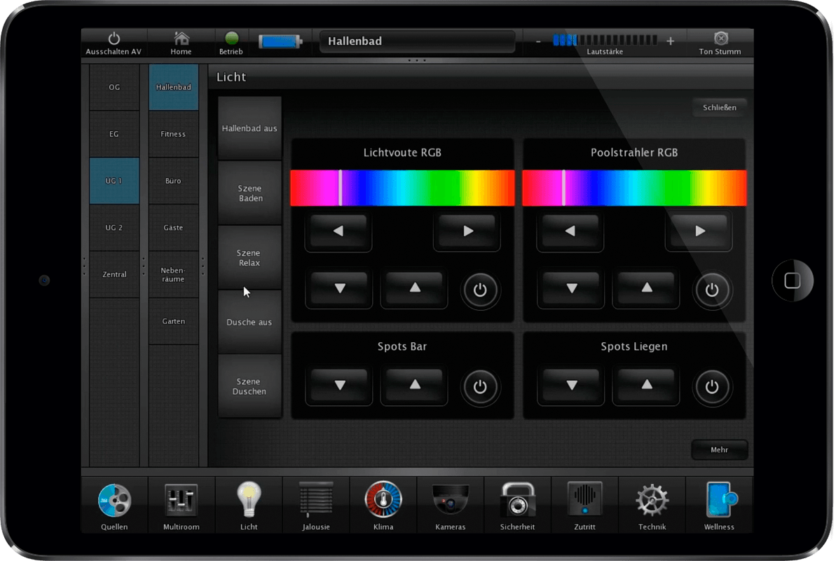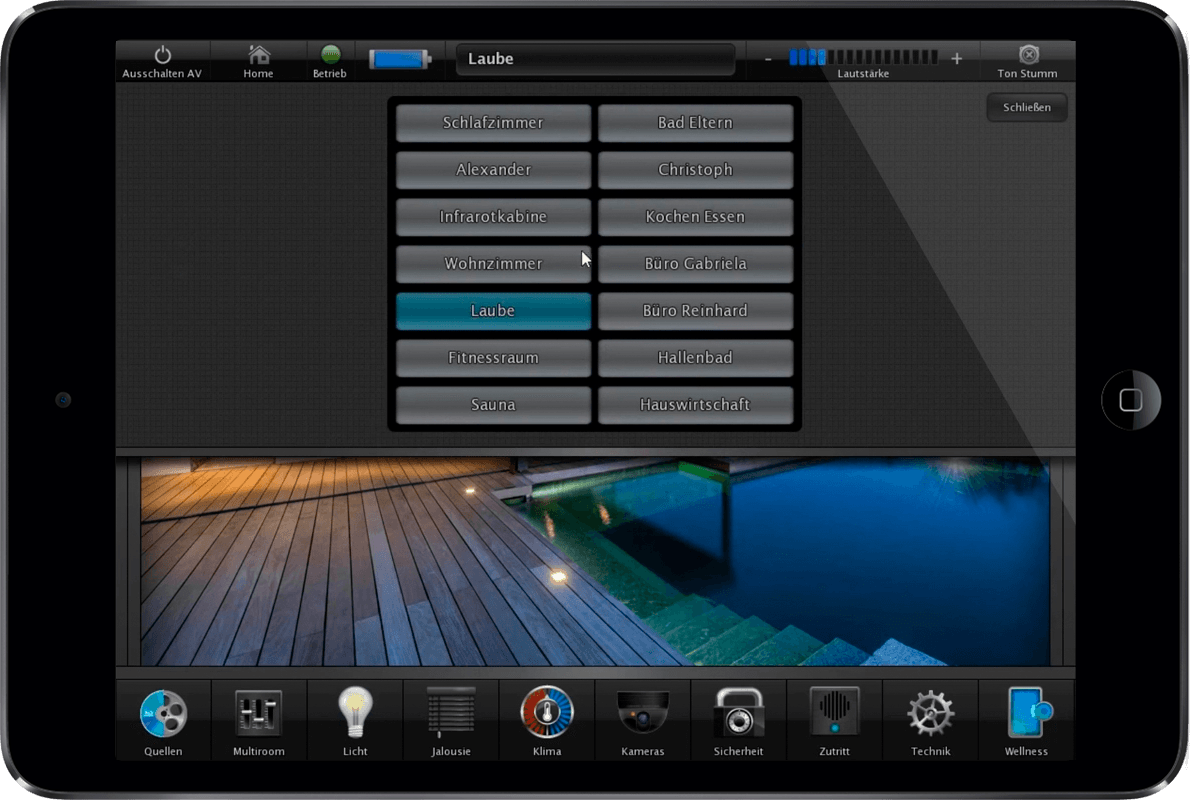 It is an 1200m2 big private house, there live 2 parents and 2 kids. the main focus is to reach the maximum quality of life. so it was important to make an user interface which is really easy. we designed the user interface with the pictures of rooms, so you always know which room you control. only the features which are in the room will showed by userinterface. from the video- intercom, the entry, lightcontrol, shades, pool, sauna, multimedia to the science of measuring and control engineering there was many cutting surfaces to define to have on the end an working solution. we control every temperature sensor, every pump and so on. we also have an technican back end interface for all settings. the user have the front end easy interface where he use the daily features.