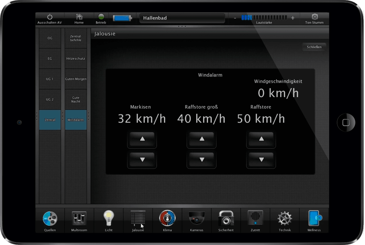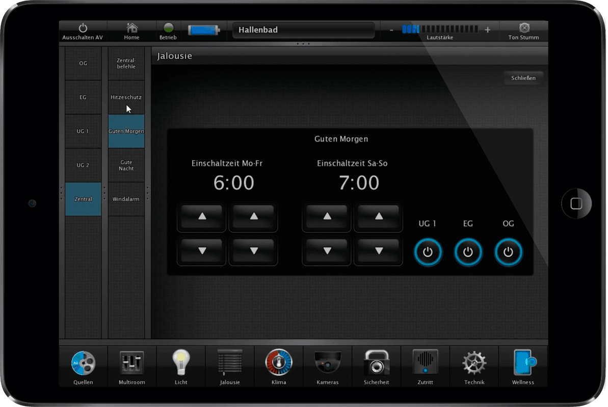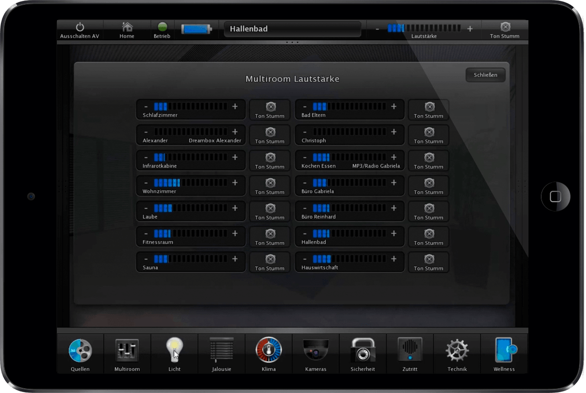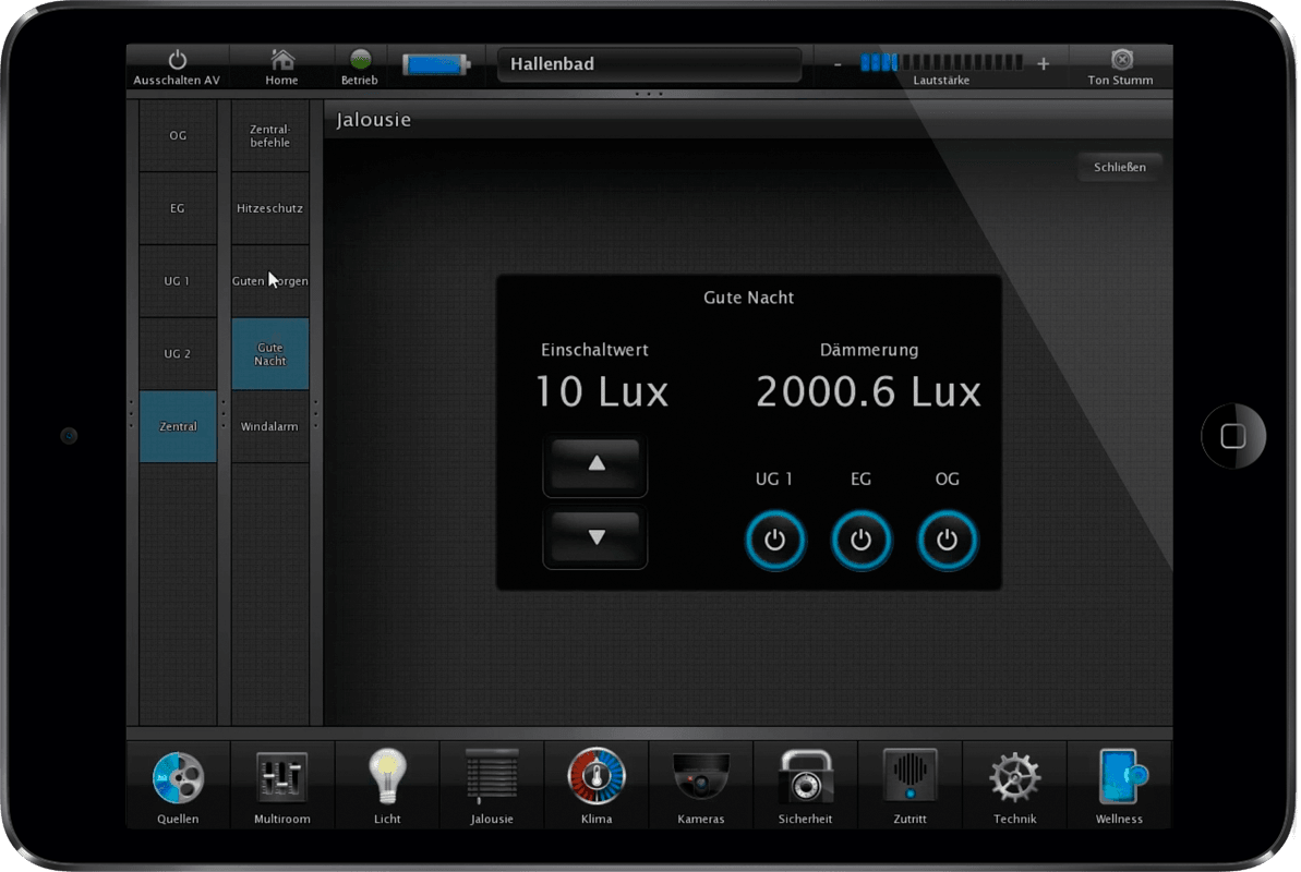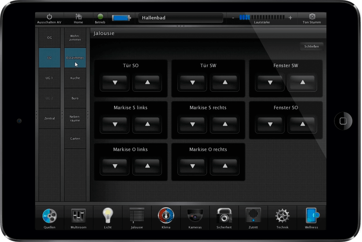 It is an 1200m2 big private house, there live 2 parents and 2 kids. the main focus is to reach the maximum quality of life. so it was important to make an user interface which is really easy. we designed the user interface with the pictures of rooms, so you always know which room you control. only the features which are in the room will showed by userinterface. from the video- intercom, the entry, lightcontrol, shades, pool, sauna, multimedia to the science of measuring and control engineering there was many cutting surfaces to define to have on the end an working solution. we control every temperature sensor, every pump and so on. we also have an technican back end interface for all settings. the user have the front end easy interface where he use the daily features.
