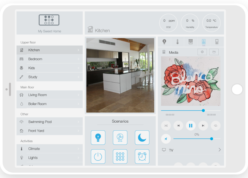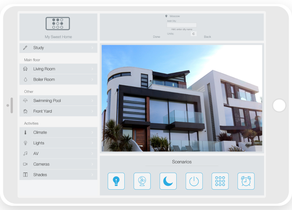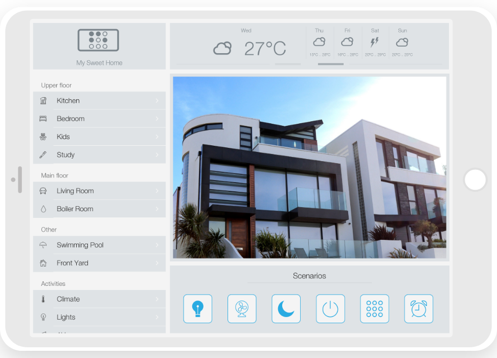 ready widgets to control light, blinds (with animation), cameras, climate, Audio/Video equipment, scenes.