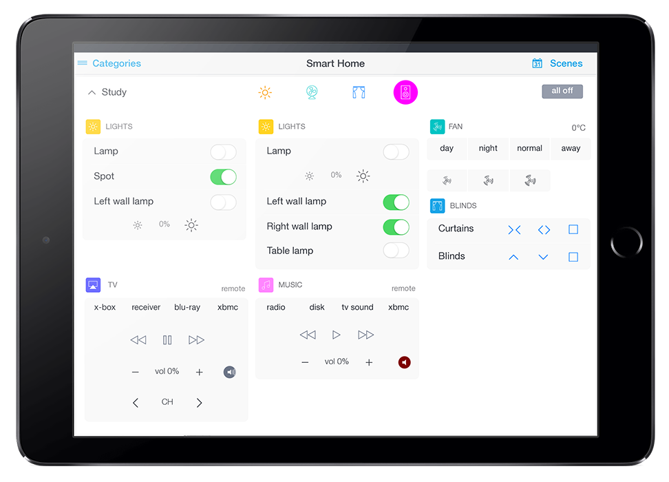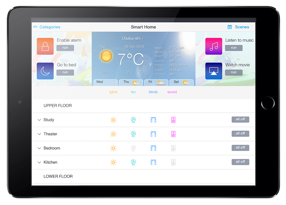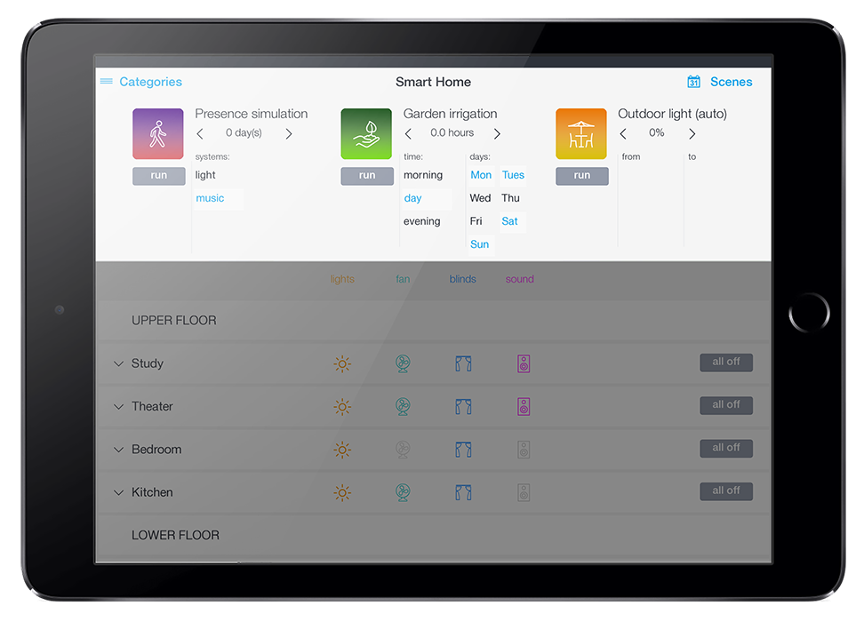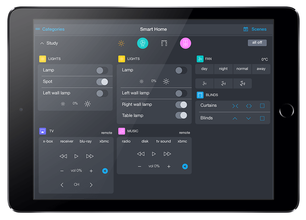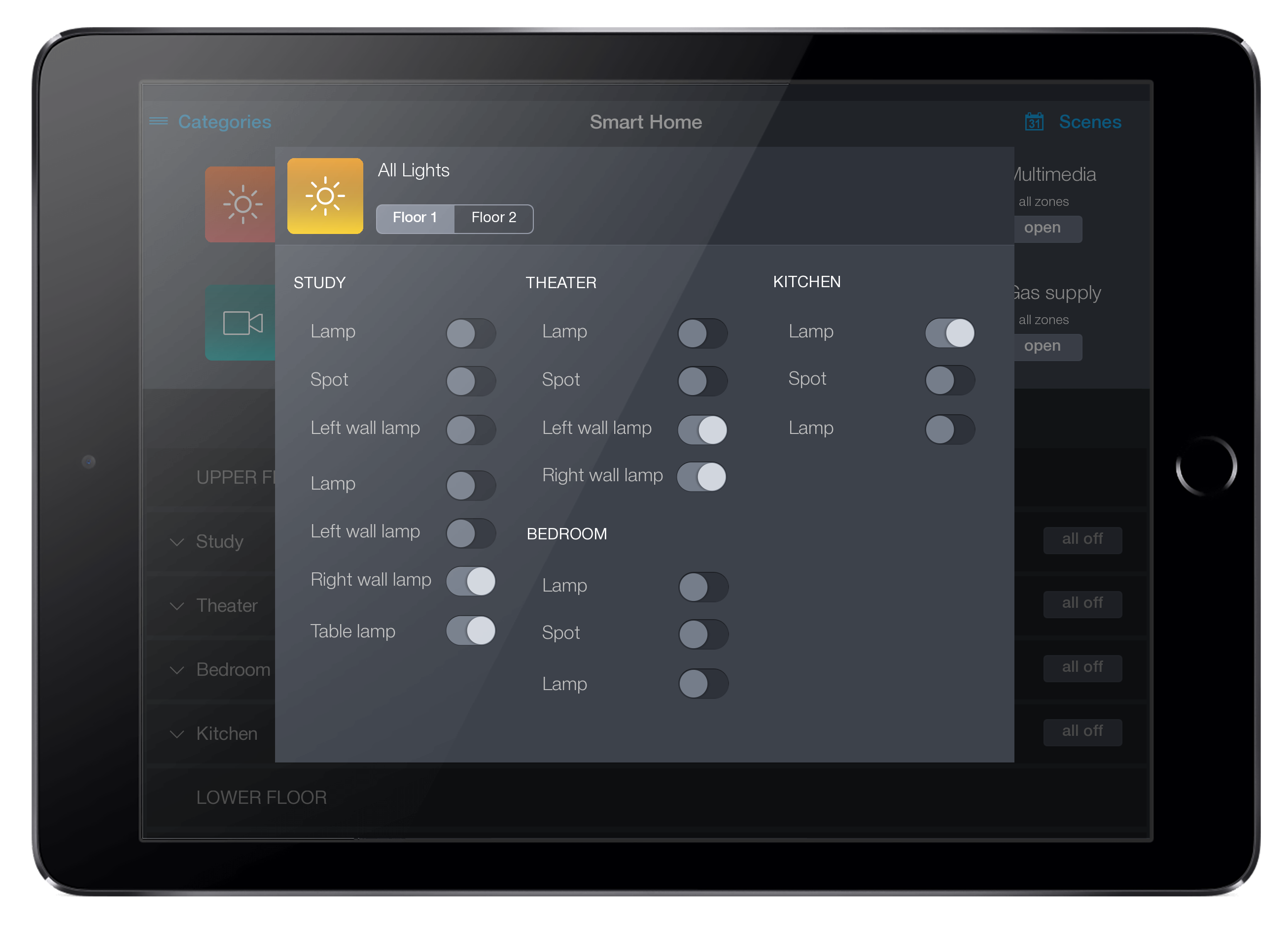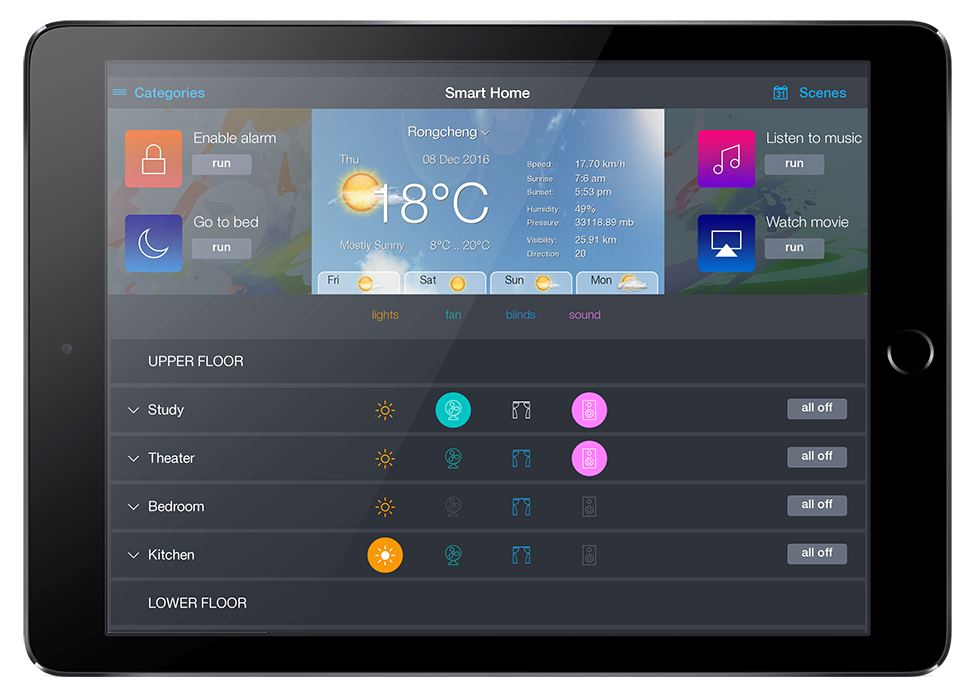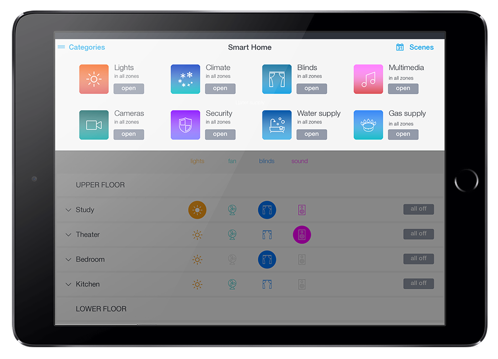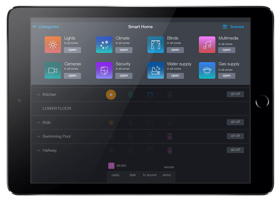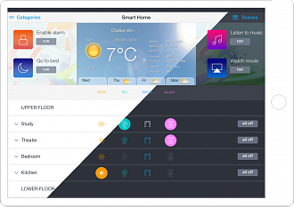 Navigation and logics of the interface is based on drop-down lists. It provides intuitive control of Smart home, office, apartment, home theater. The interface has two versions: Light edition and Dark edition.