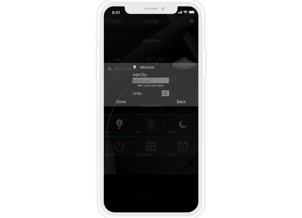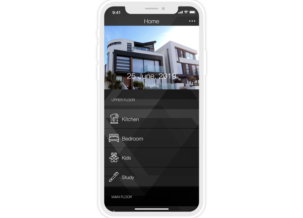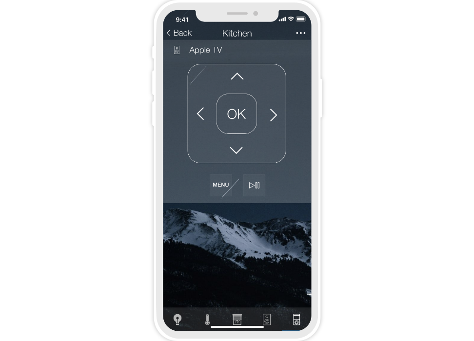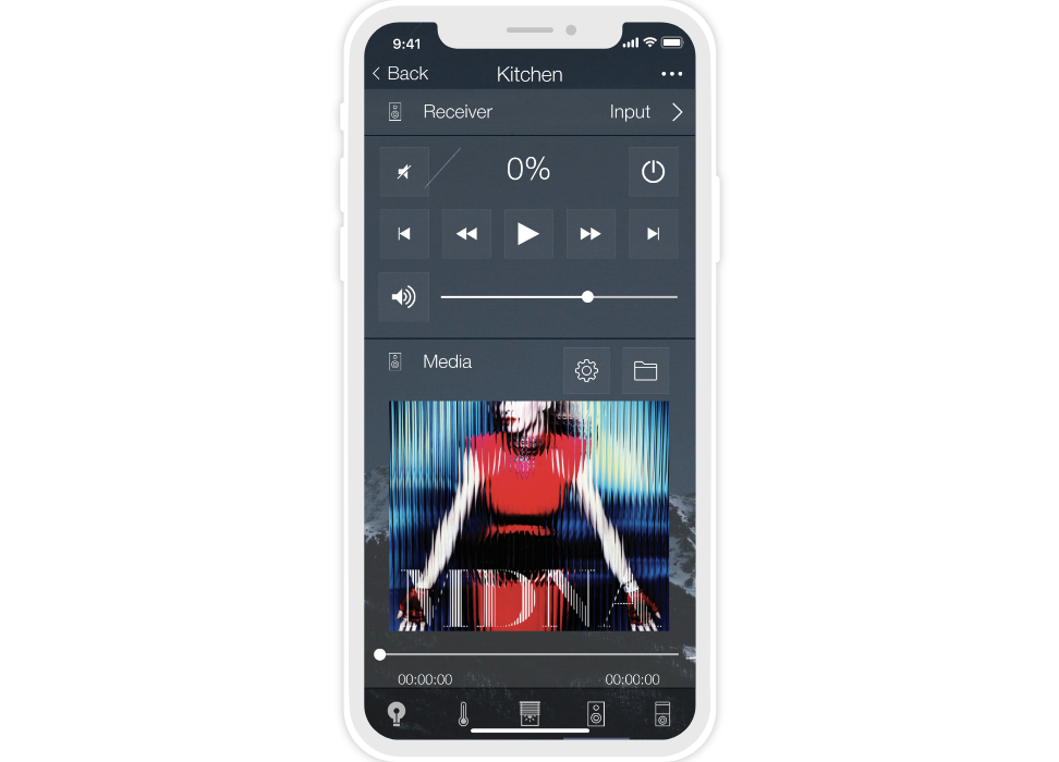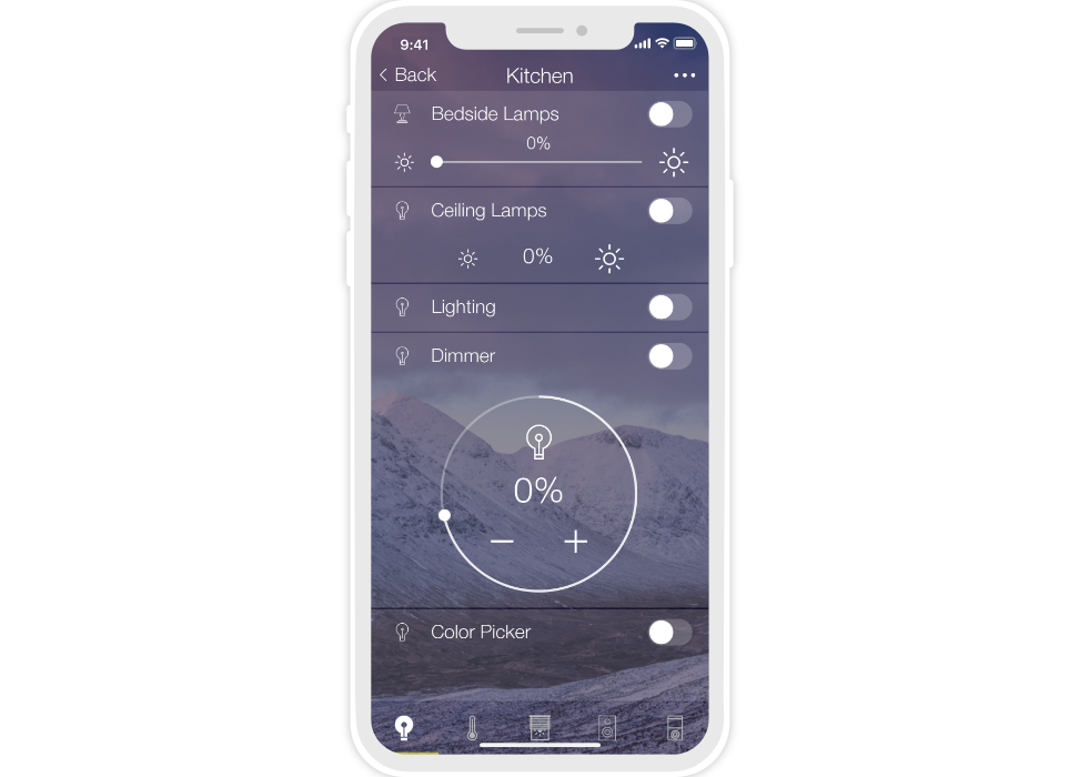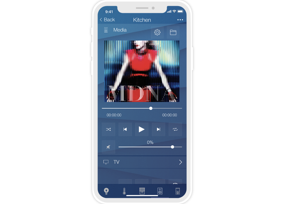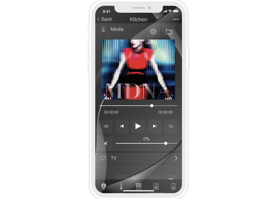 «Flex» is a dark semi-transparent style with a background image. There are 10 backgrounds to select from, but your own image can also be used. Thanks to the change of backgrounds (consequently the color) the interface can suit the design of any apartment or house.