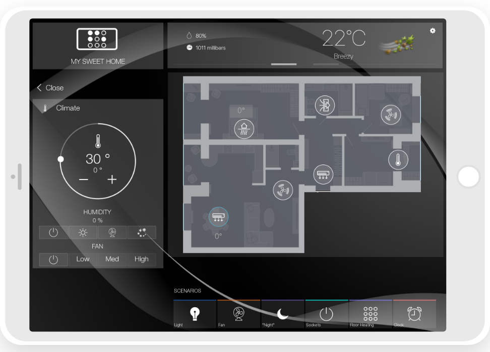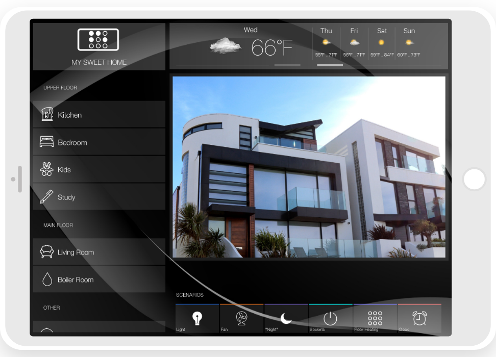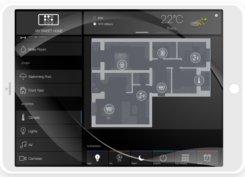 - ready widgets to control light, blinds (with animation), cameras, climate, Audio/Video equipment, scenes.