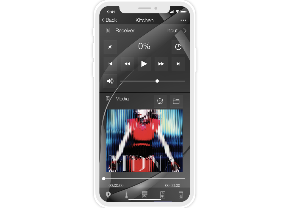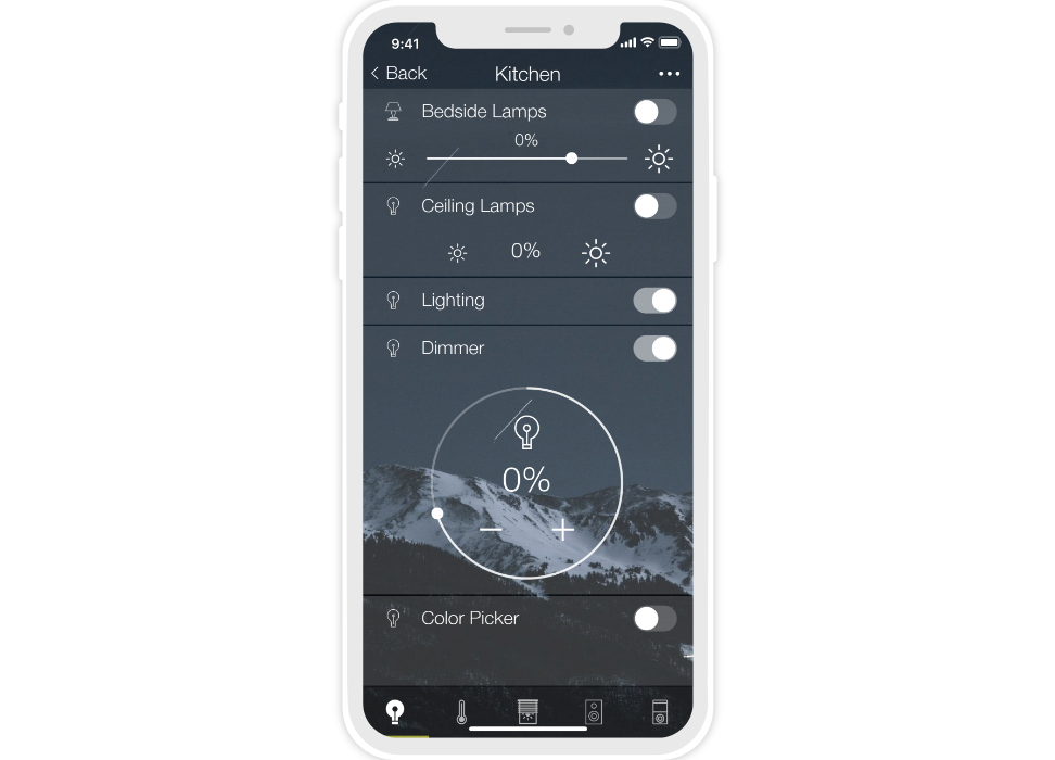 «Flex» is a dark semi-transparent style with a background image. There are 10 backgrounds to select from, but your own image can also be used. Thanks to the change of backgrounds (consequently the color) the interface can suit the design of any apartment or house.